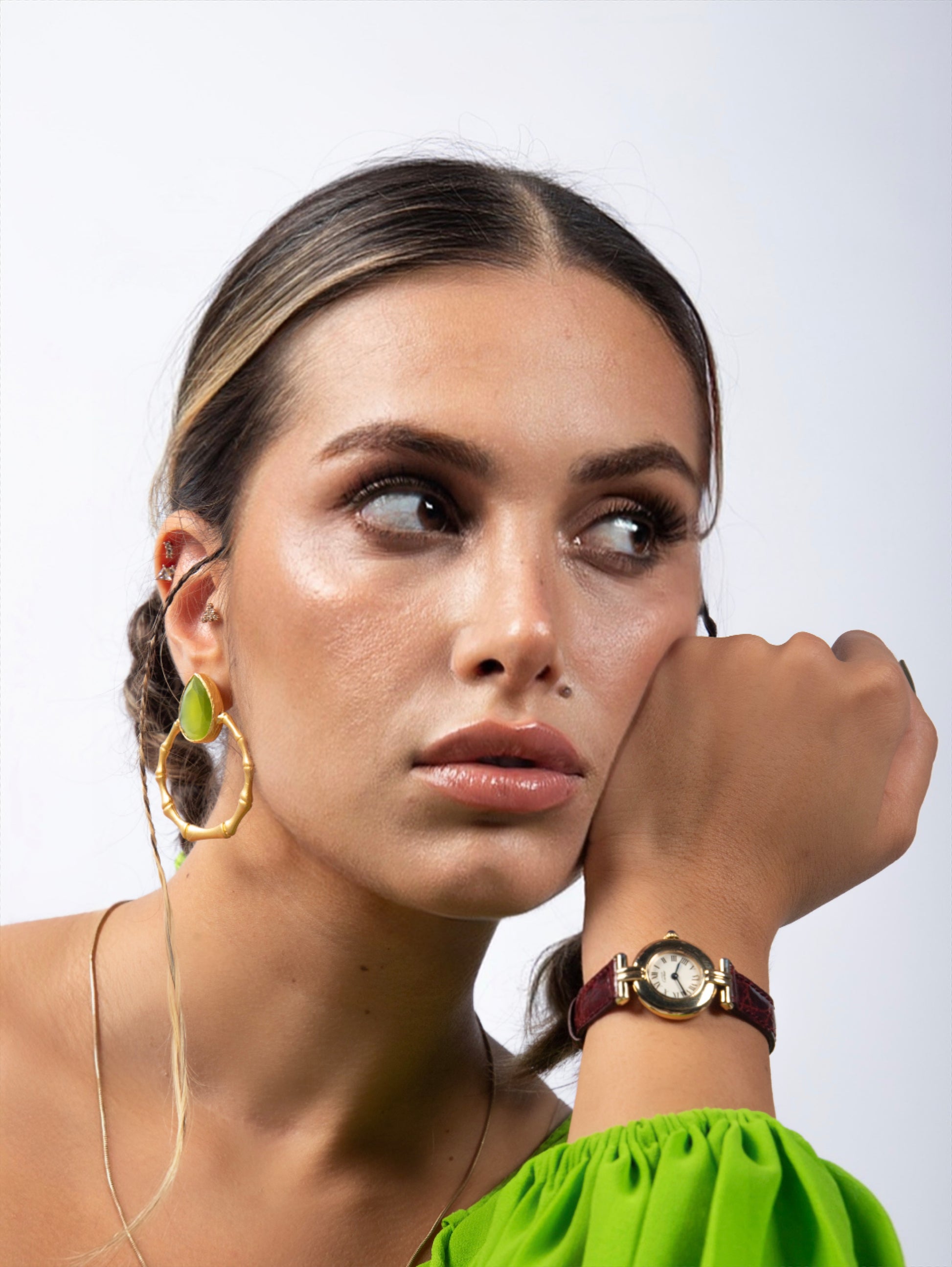Cartier Must de Colisée, rafine zarafetin vücut bulmuş hali. 925 ayar gümüş üzerine yaldızlı kaplamayla kaplı 24 mm yuvarlak kasası, siyah Roma rakamlı aydınlık krem rengi kadranı çerçeveleyen iki belirgin yatay kulakla öne çıkıyor. Safir kabaşon kurma kolu ve mavi çelik kollar, Cartier'nin işçilik ve detay mirasını yansıtıyor.
