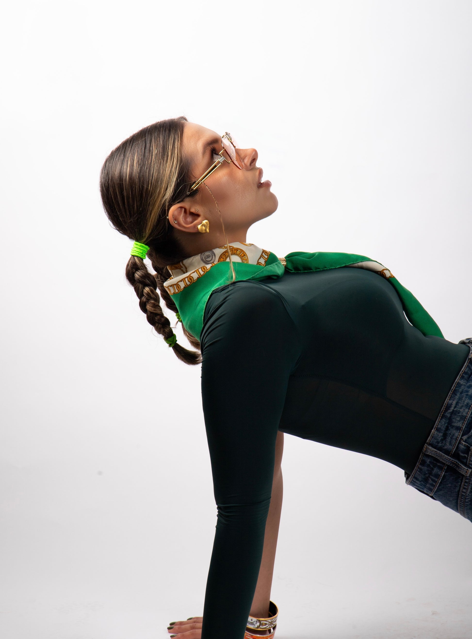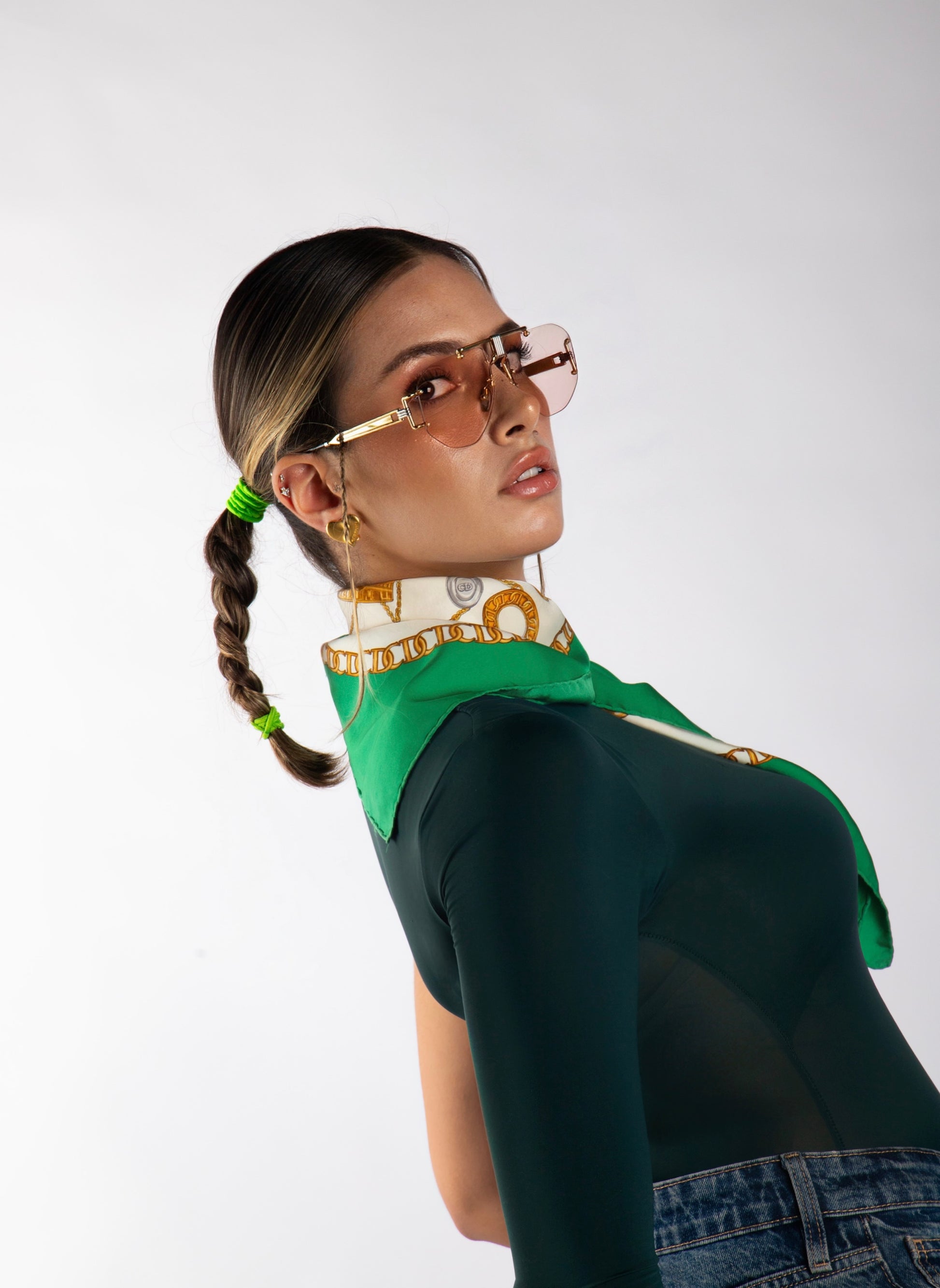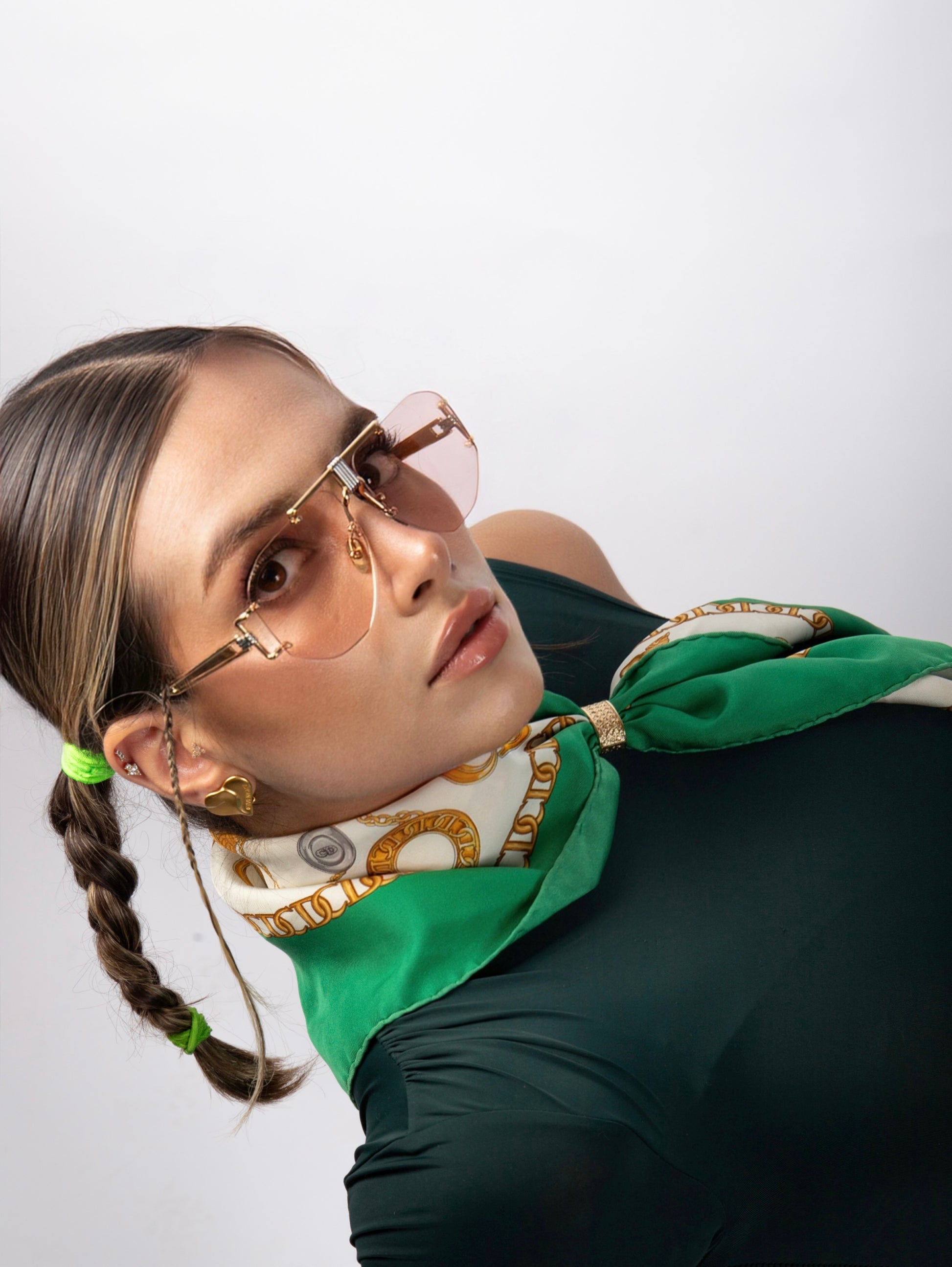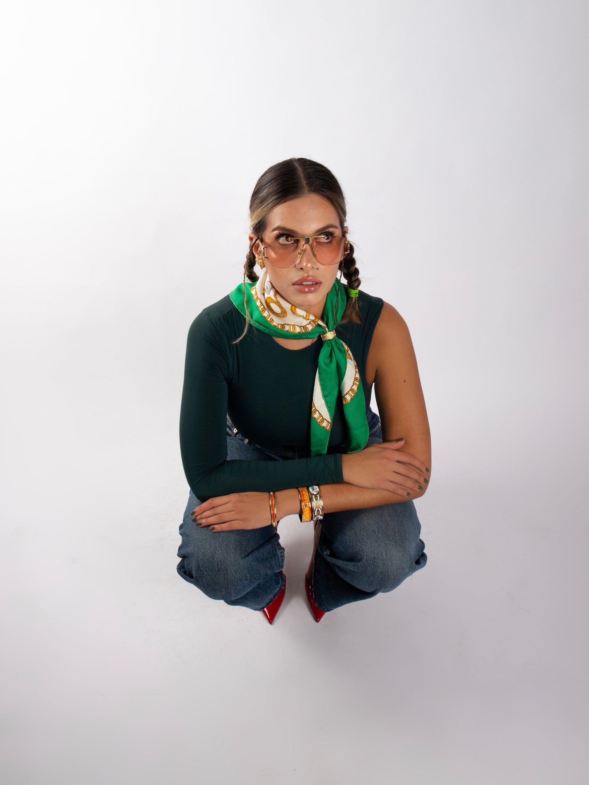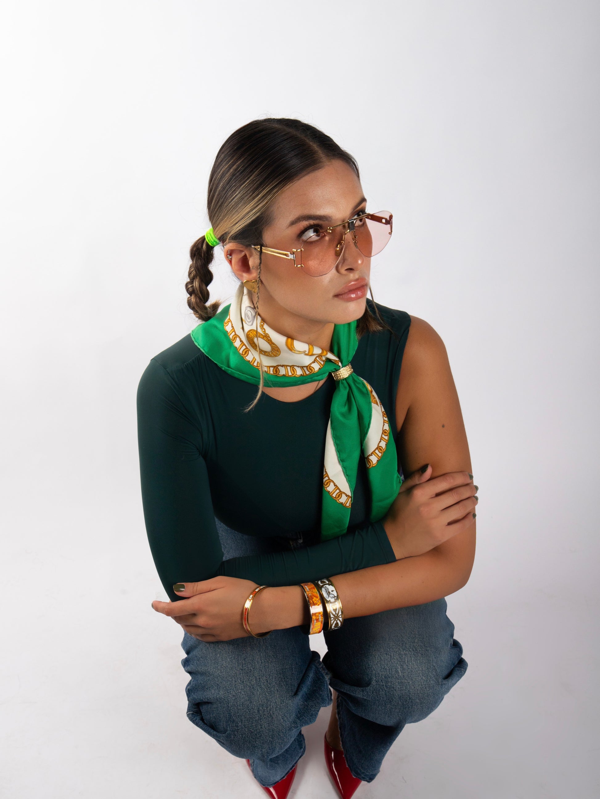 Christian Dior'un otantik vintage hazinesi olan bu ipek eşarp, markanın ikonik zincir motifini canlı yeşil ve altın tonlarıyla işliyor. Standart carré'den biraz daha küçük olan mini boy , şık bir kravattan saç aksesuarına veya çanta aksesuarına kadar çok yönlü bir stil sunuyor.