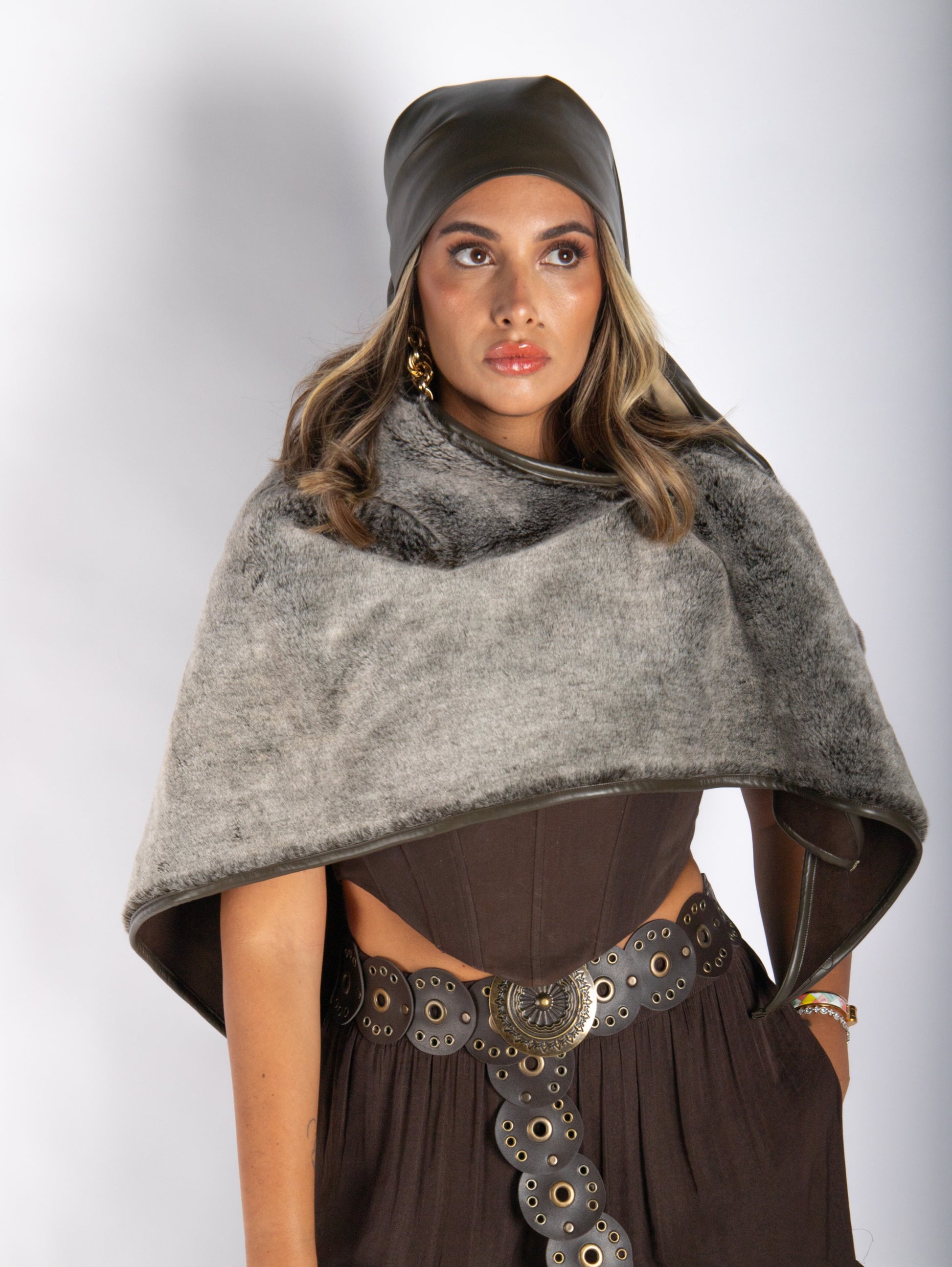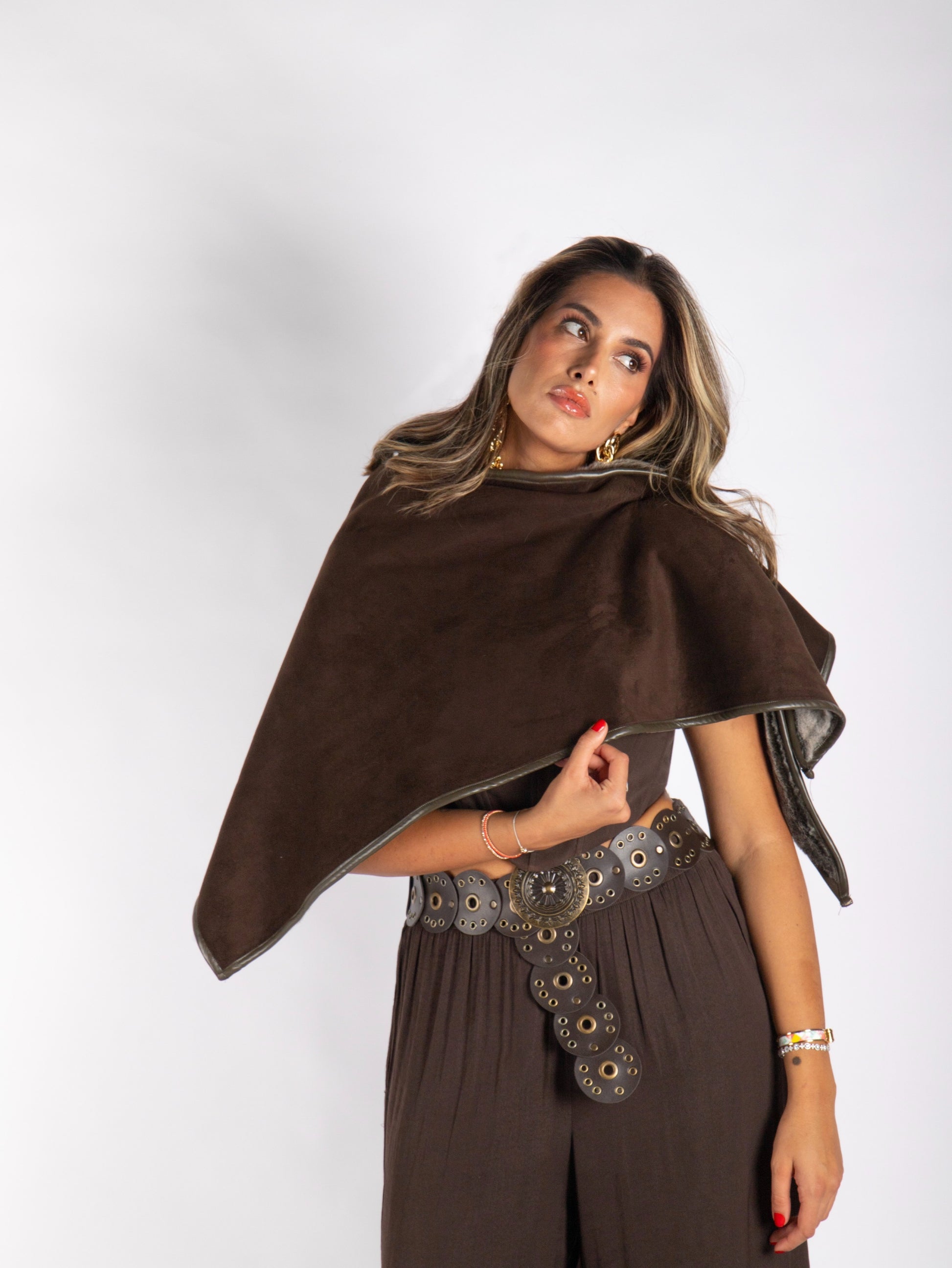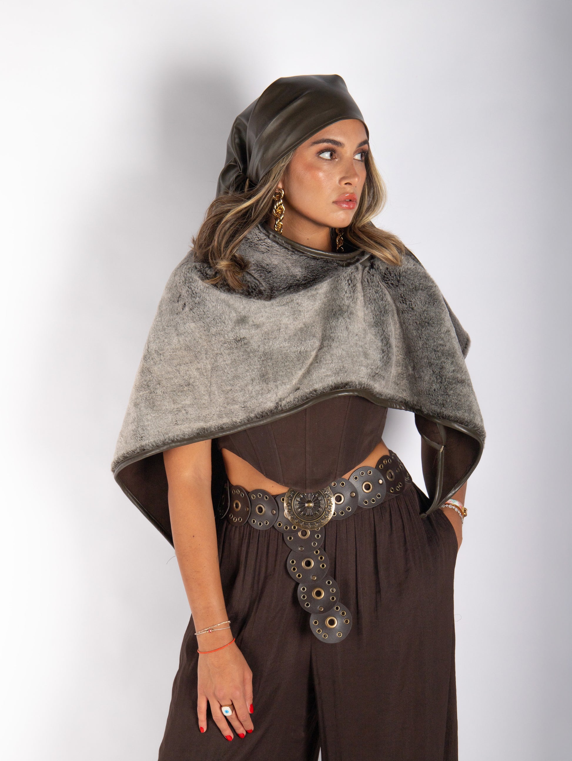 Omuzlara dökülen bu pelerin, vücudu kolayca şekillendirir; kullanışlılığın ötesine geçip varlığın ta kendisi haline gelen bir aksesuar. İster cesur bir ihtişam için kürk önden, ister sade bir zarafet için süet yanlardan giyin, bu pelerin ruh haline, ana ve harekete uyum sağlar.