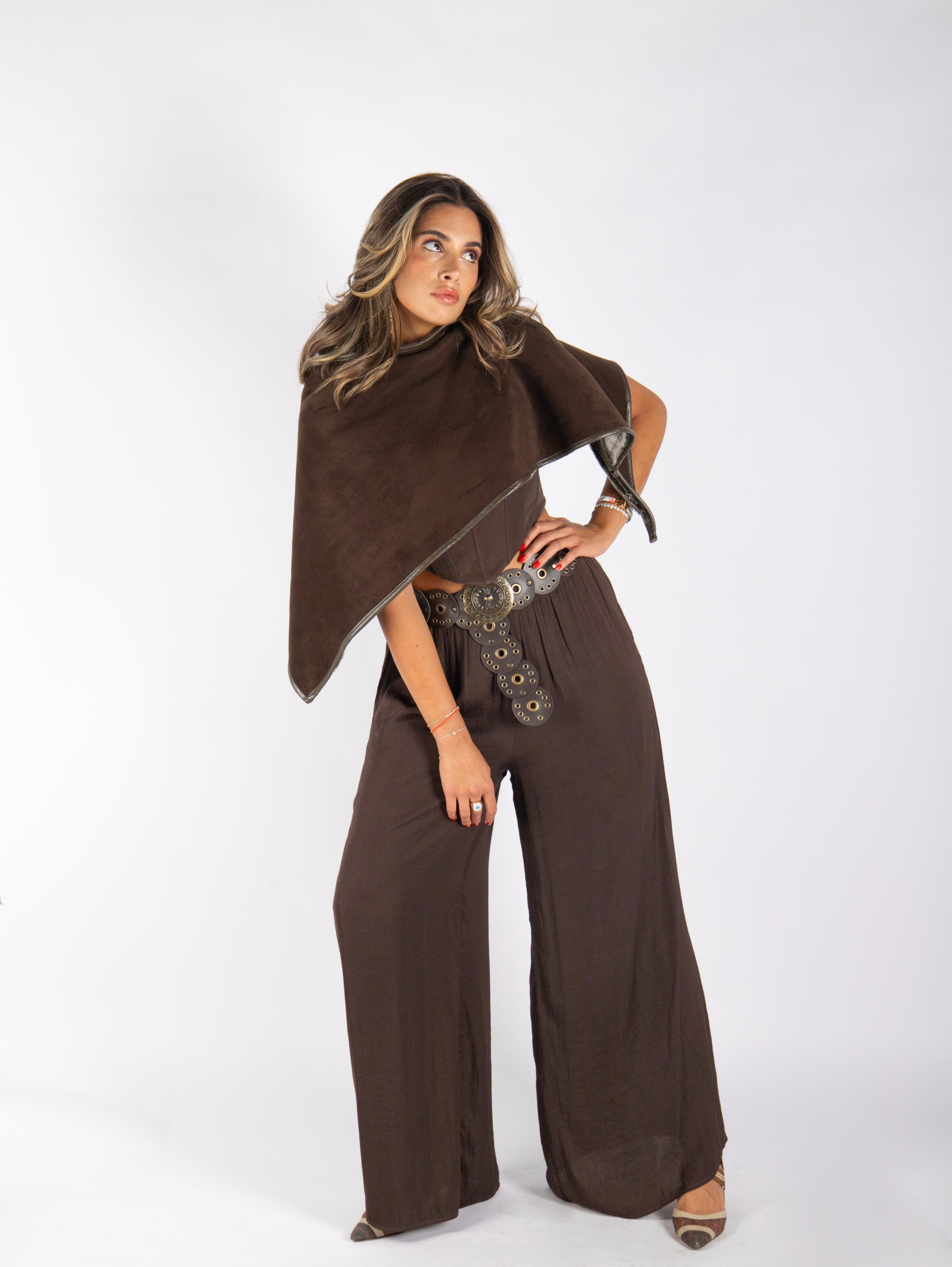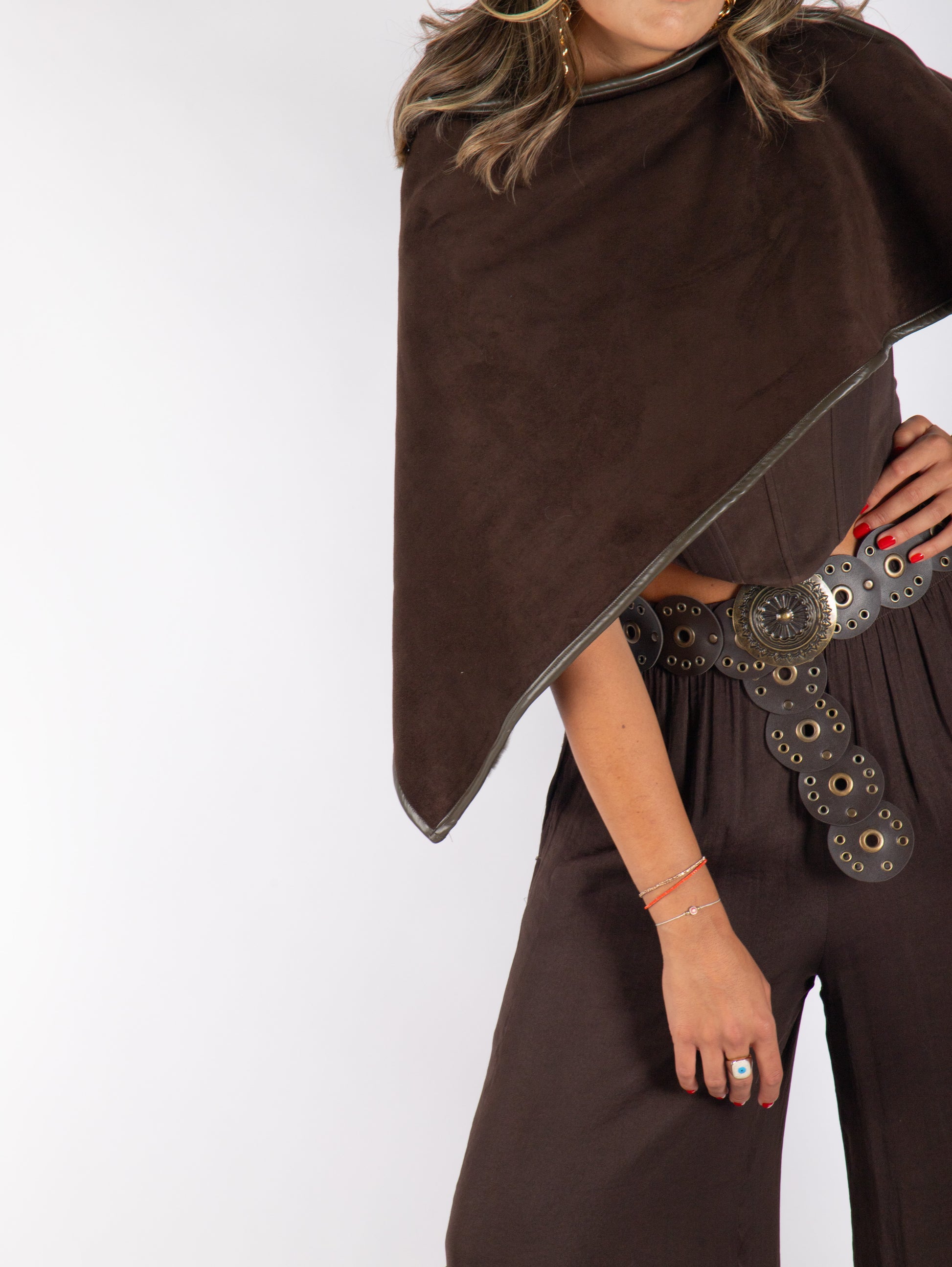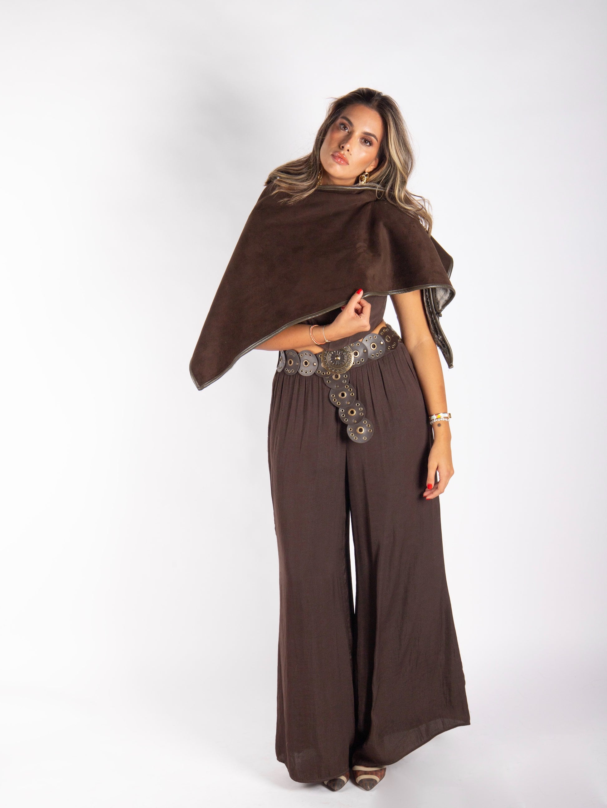 Omuzlara dökülen bu pelerin, vücudu kolayca şekillendirir; kullanışlılığın ötesine geçip varlığın ta kendisi haline gelen bir aksesuar. İster cesur bir ihtişam için kürk önden, ister sade bir zarafet için süet yanlardan giyin, bu pelerin ruh haline, ana ve harekete uyum sağlar.