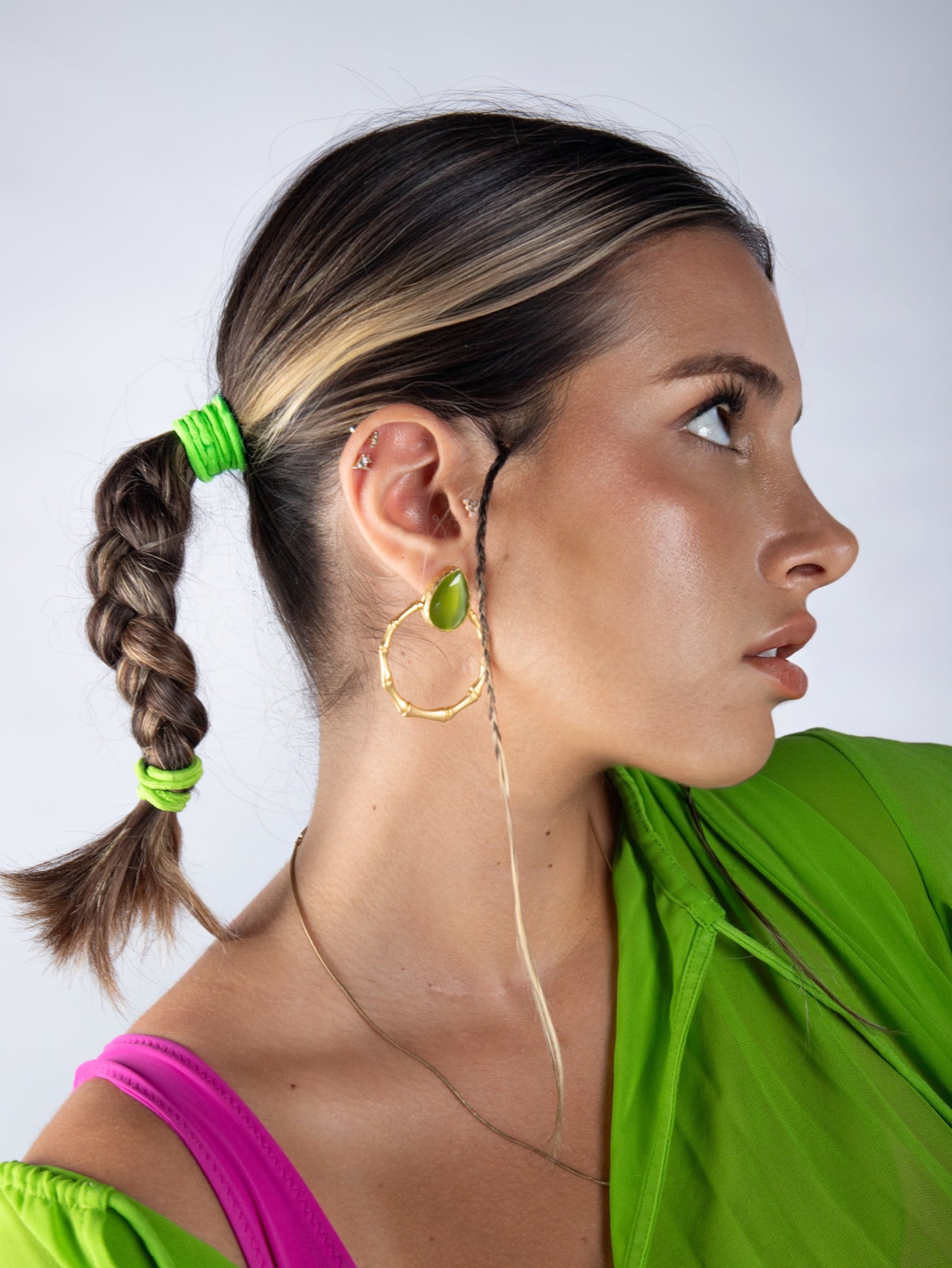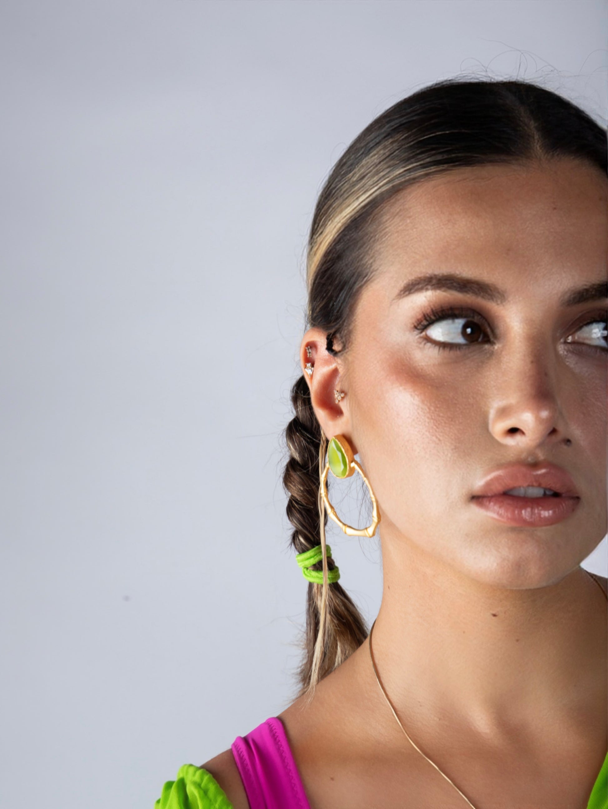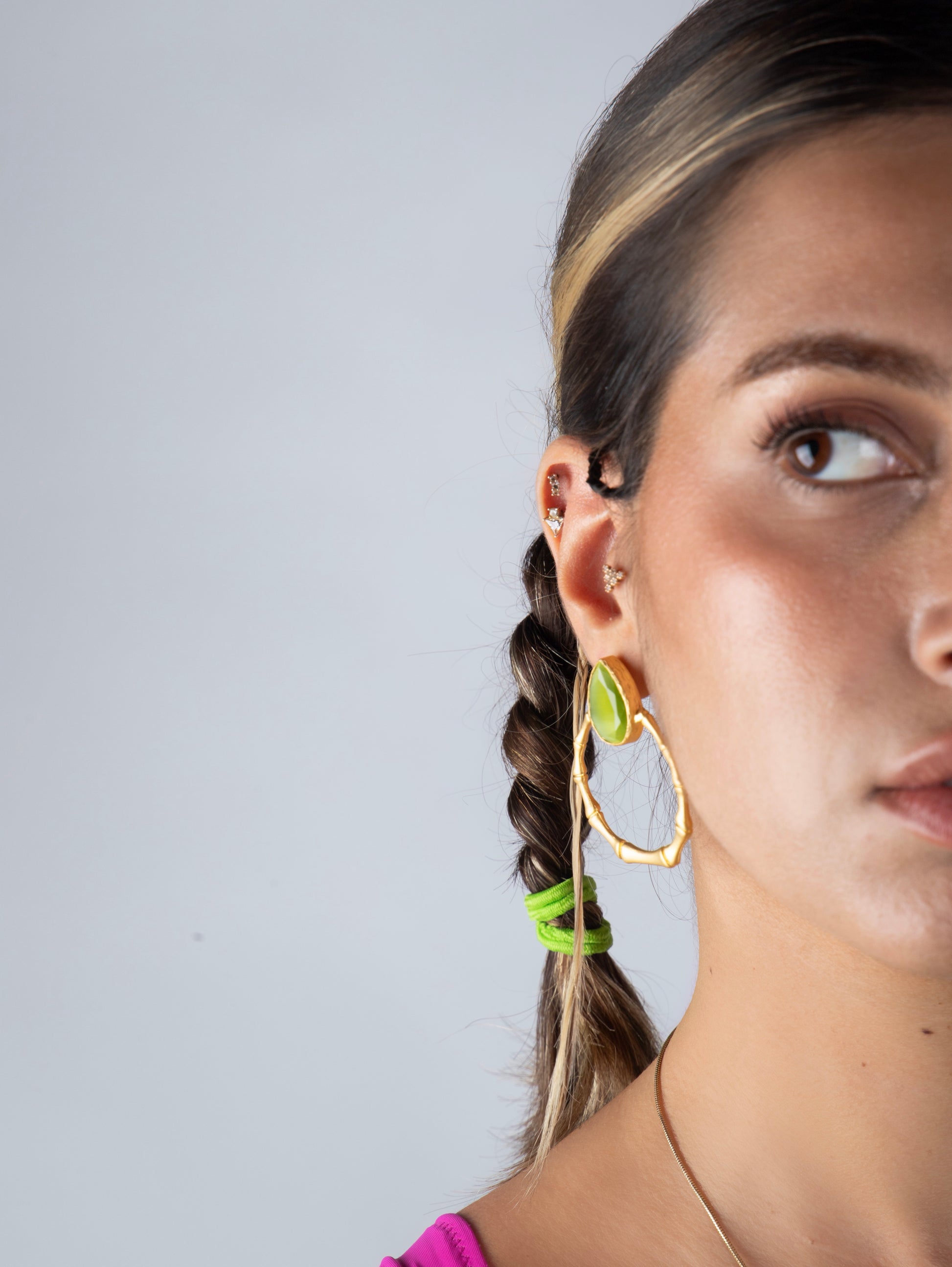 Yeşil yeşim halka küpeler, gerçek yeşil yeşim taşlarının doğal güzelliğini vurgulamak için el işçiliğiyle üretilmiştir ve kararmayan pirinç kaplamanın sıcak parıltısıyla birleştirilmiştir. Canlı yeşil taşlar organik bir zarafet dokunuşu katarken, altın halkalar çağdaş ve giyilebilir bir ifade yaratır.