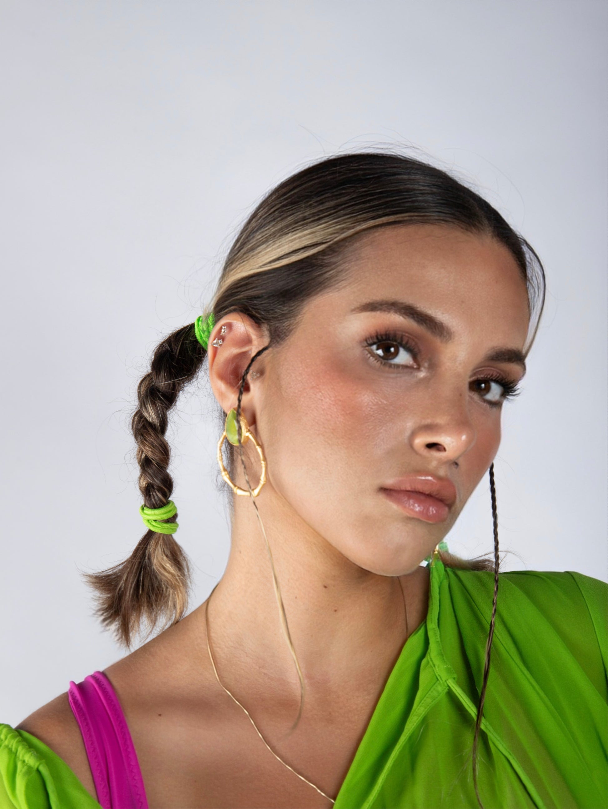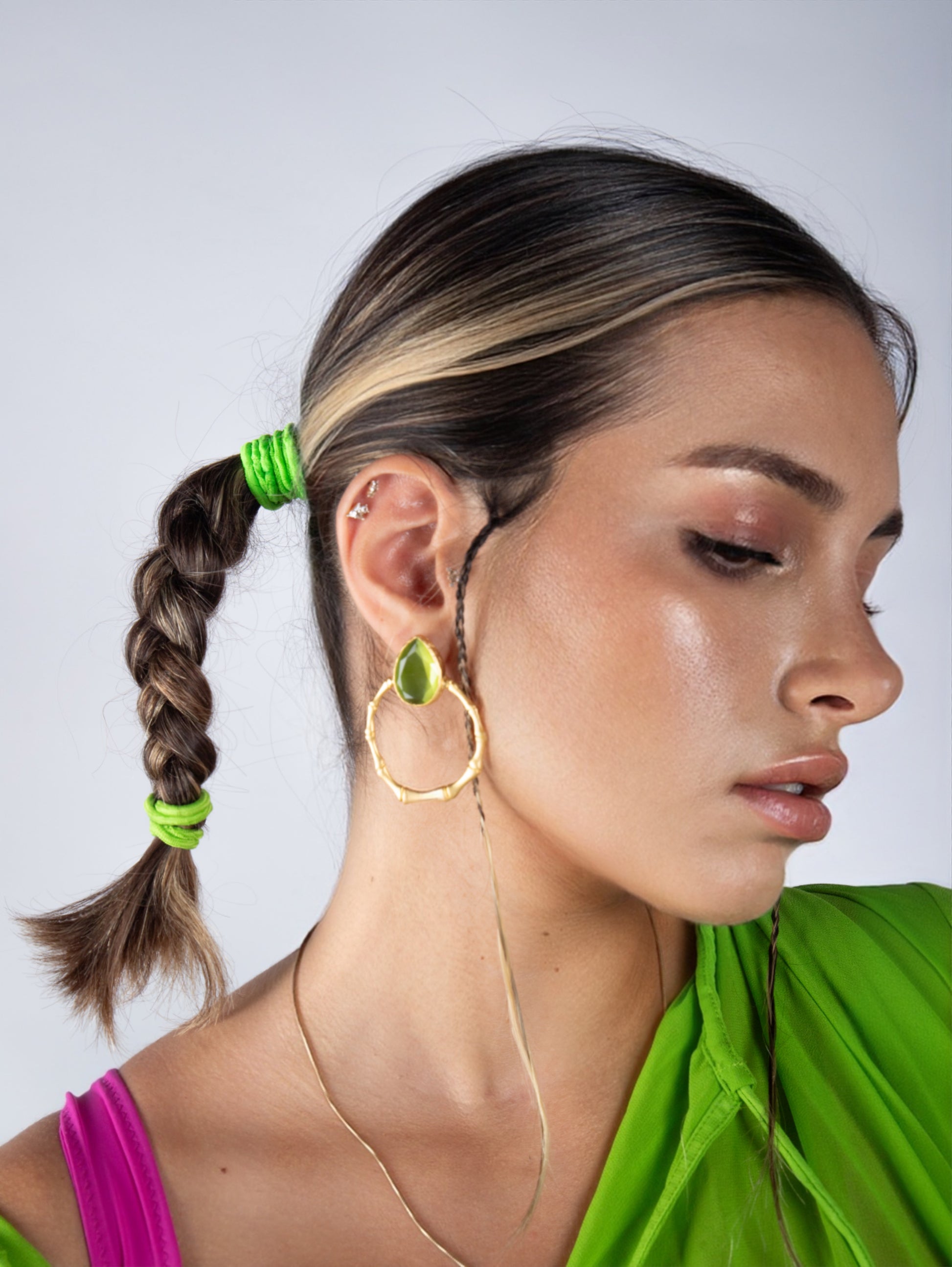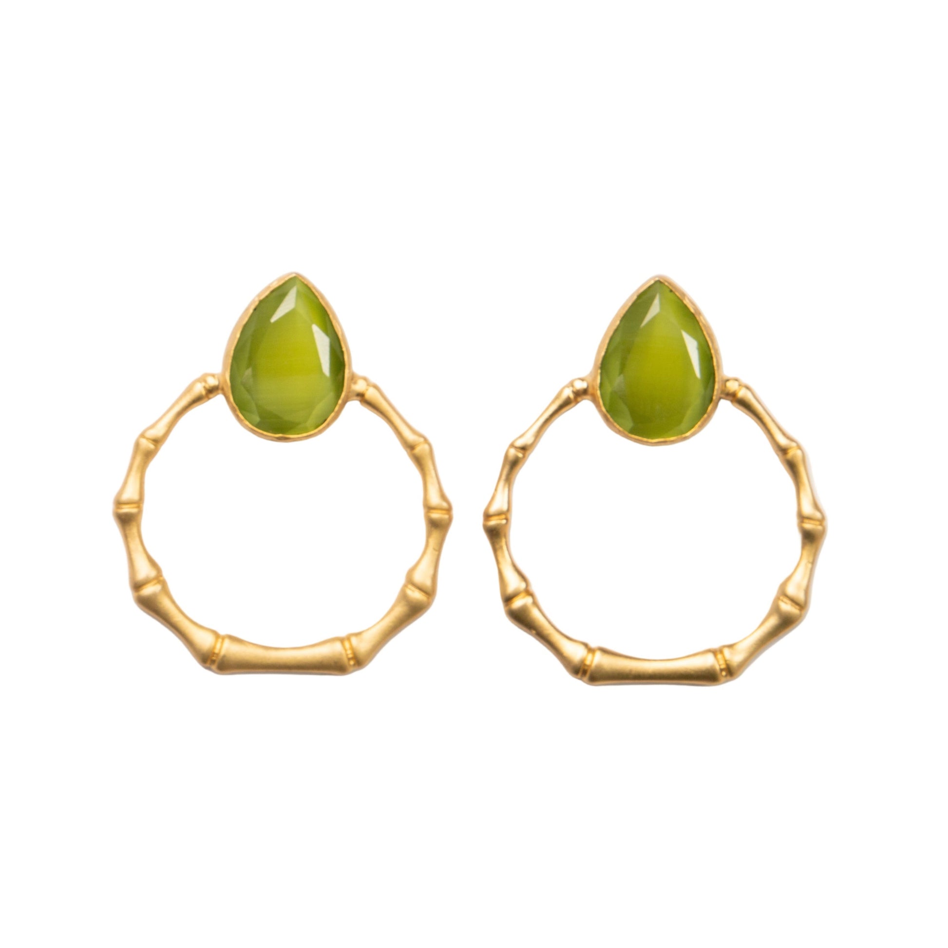 Yeşil yeşim halka küpeler, gerçek yeşil yeşim taşlarının doğal güzelliğini vurgulamak için el işçiliğiyle üretilmiştir ve kararmayan pirinç kaplamanın sıcak parıltısıyla birleştirilmiştir. Canlı yeşil taşlar organik bir zarafet dokunuşu katarken, altın halkalar çağdaş ve giyilebilir bir ifade yaratır.