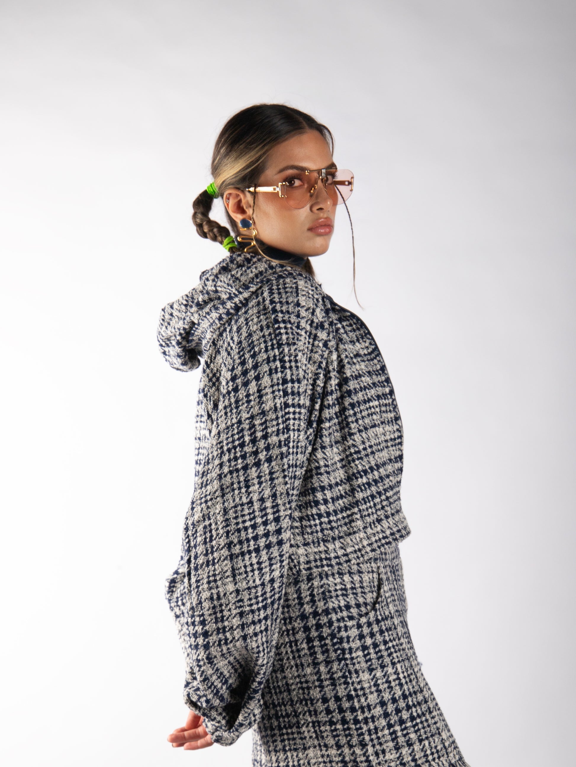 crafted in navy and ivory houndstooth tweed, the houndstooth tweed co-ord redefines classic tailoring with a modern editorial edge. the jacket features softly structured shoulders and precise lapels, while the high-waist trousers elongate the silhouette with a straight-leg cut.