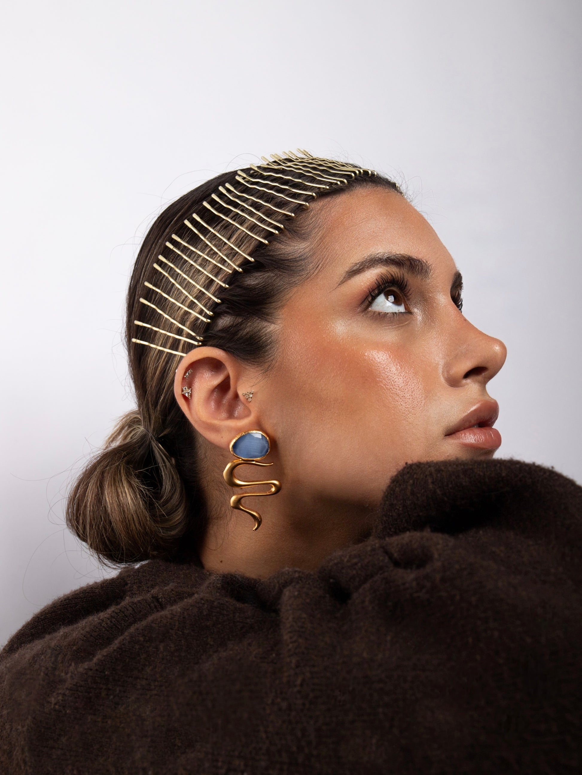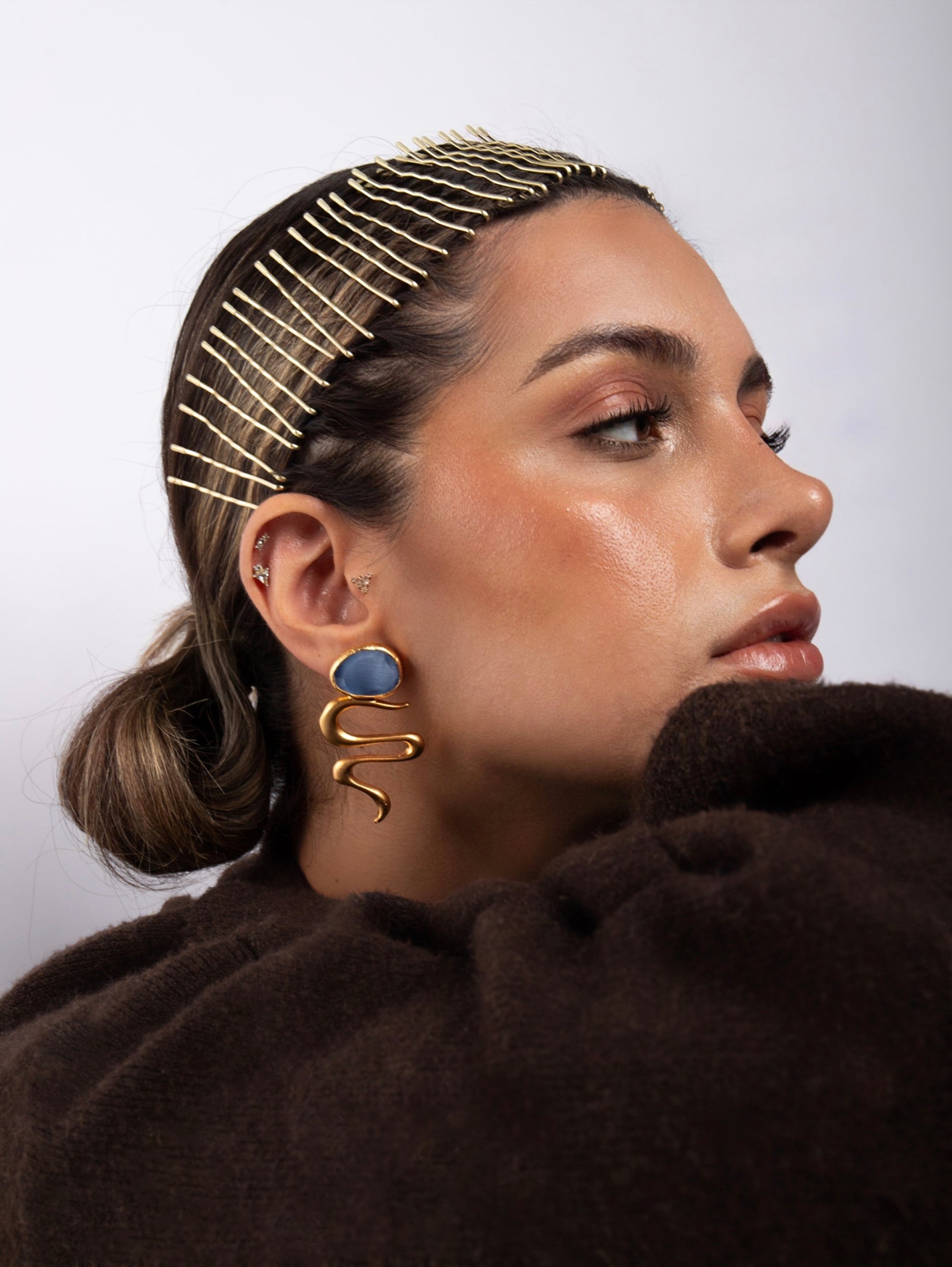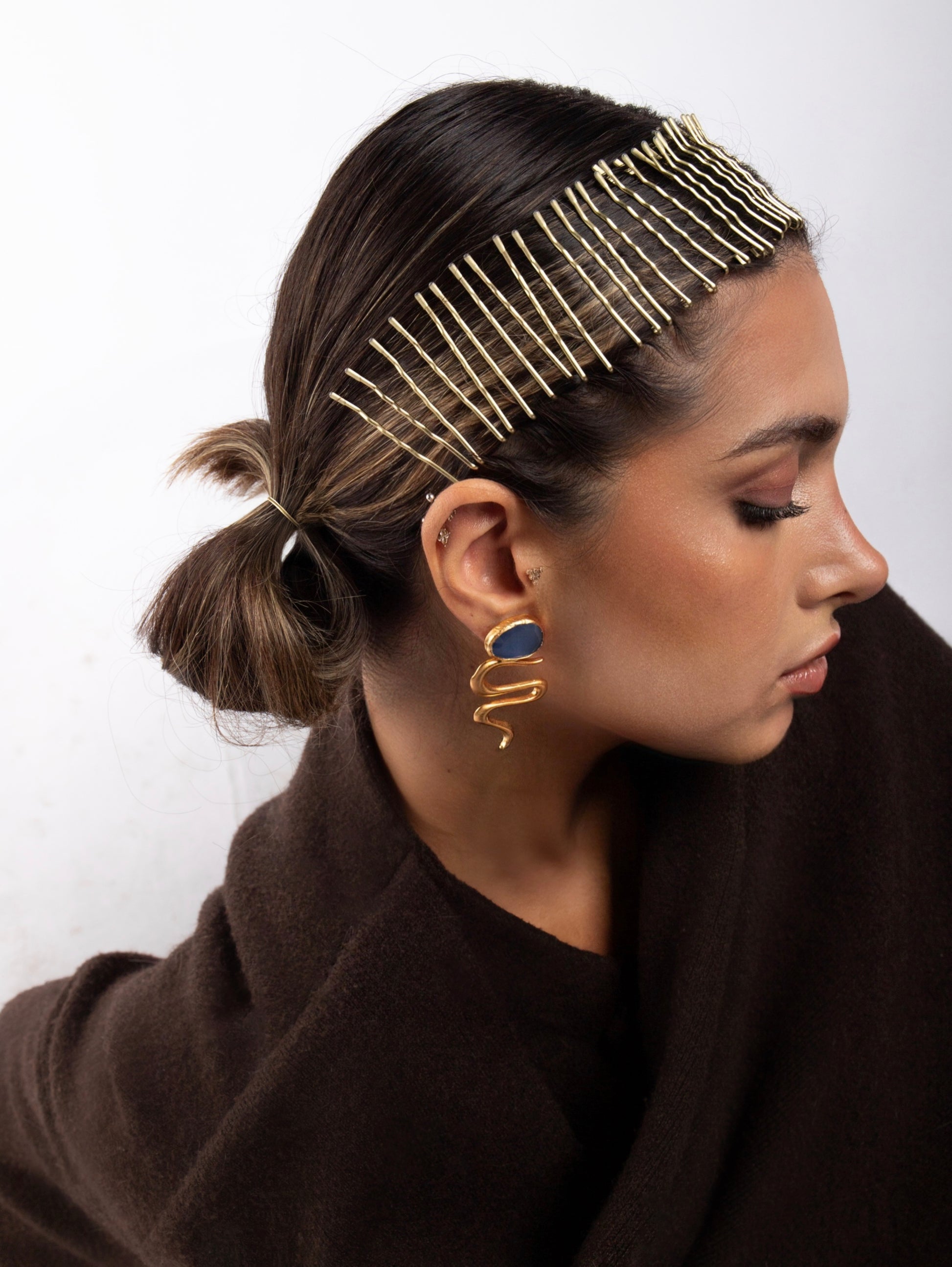 Form ve rengin cesur bir şekilde bir araya geldiği bu küpeler, koyu mavi lapis taşını pirinç kaplamadaki akıcı, kıvrımlı çizgilerle birleştiriyor. Yüzlü değerli taş, göksel yoğunluğu yansıtırken, heykelsi silueti sanatsal bir güç ve zarafet ifadesi sunuyor. Her parça elle işlenerek doğal taşı, trendleri ve zamanı aşan, giyilebilir bir sanat eserine dönüştürüyor.