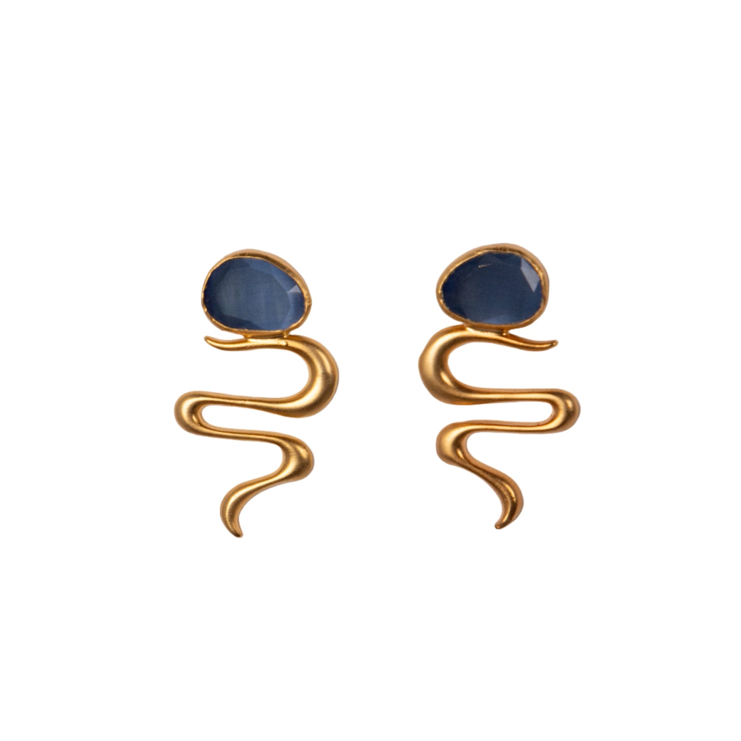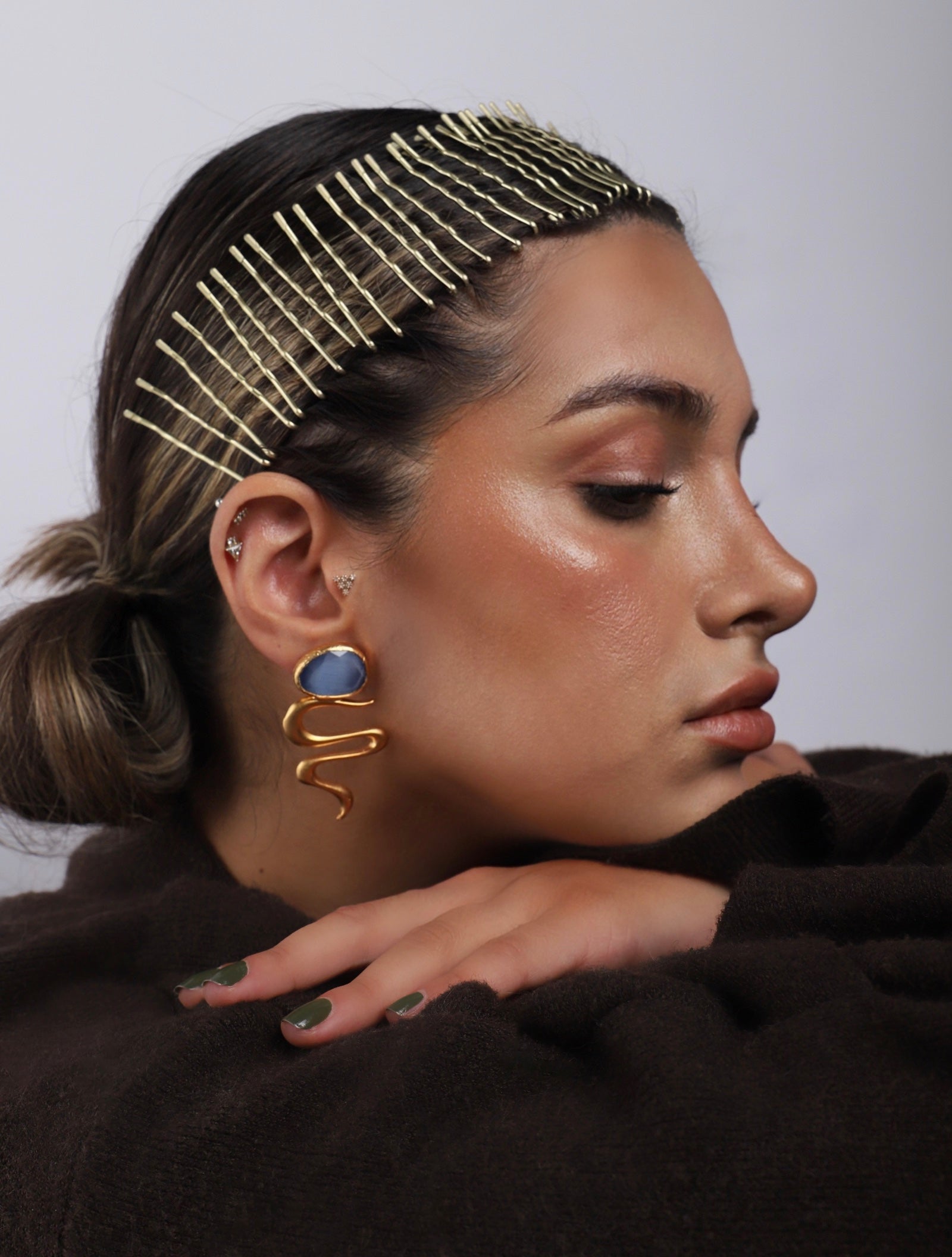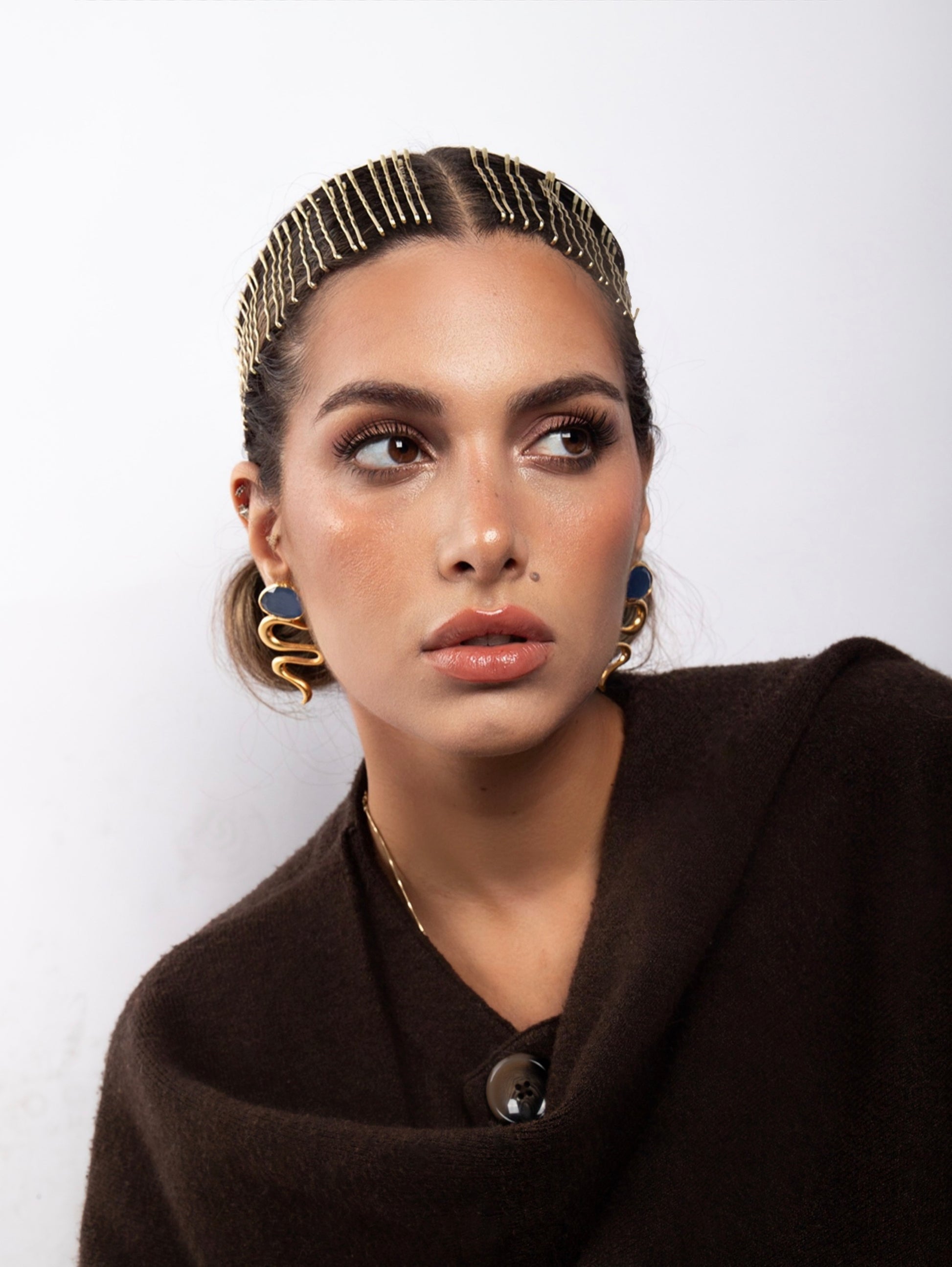 Form ve rengin cesur bir şekilde bir araya geldiği bu küpeler, koyu mavi lapis taşını pirinç kaplamadaki akıcı, kıvrımlı çizgilerle birleştiriyor. Yüzlü değerli taş, göksel yoğunluğu yansıtırken, heykelsi silueti sanatsal bir güç ve zarafet ifadesi sunuyor. Her parça elle işlenerek doğal taşı, trendleri ve zamanı aşan, giyilebilir bir sanat eserine dönüştürüyor.