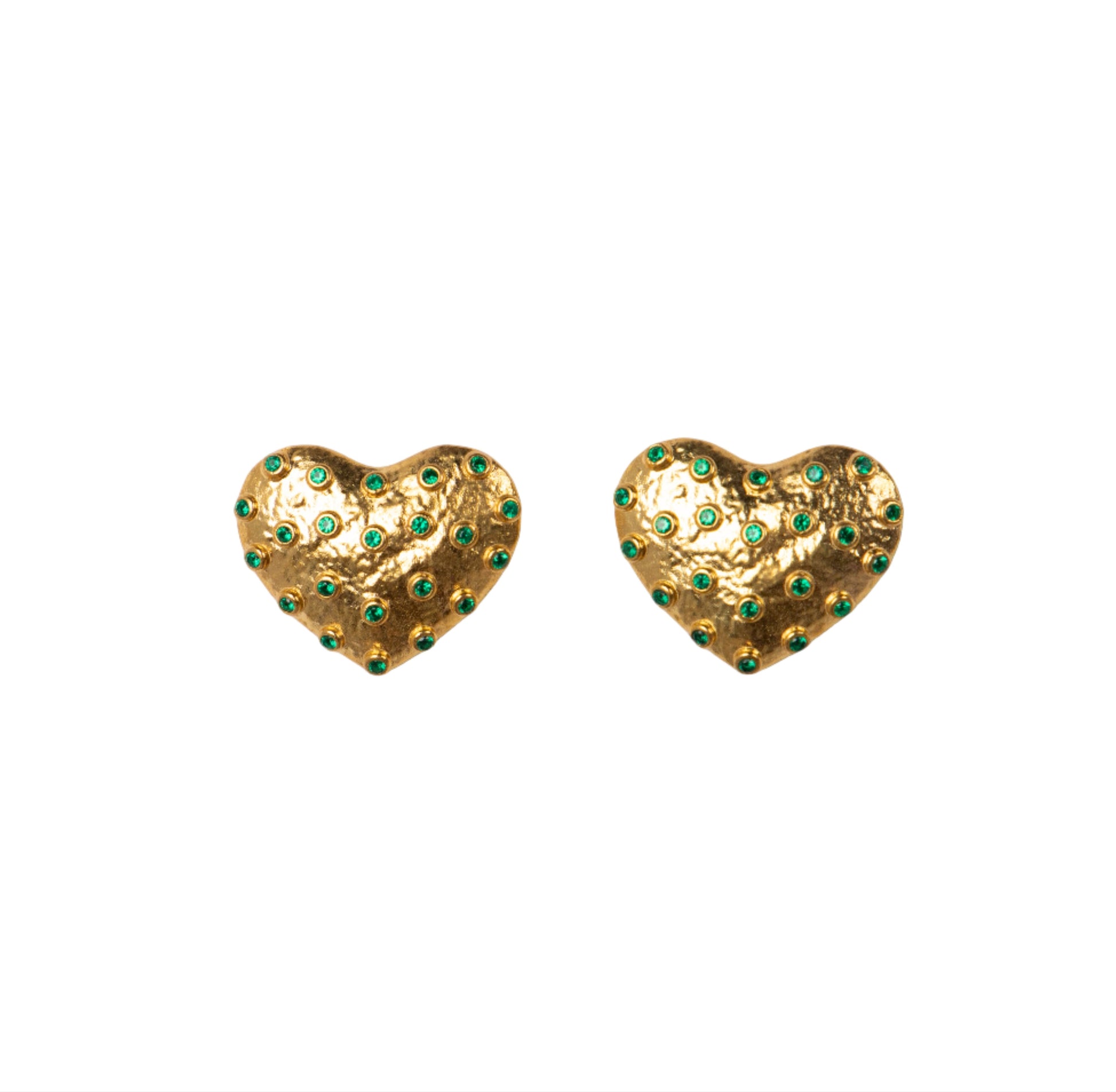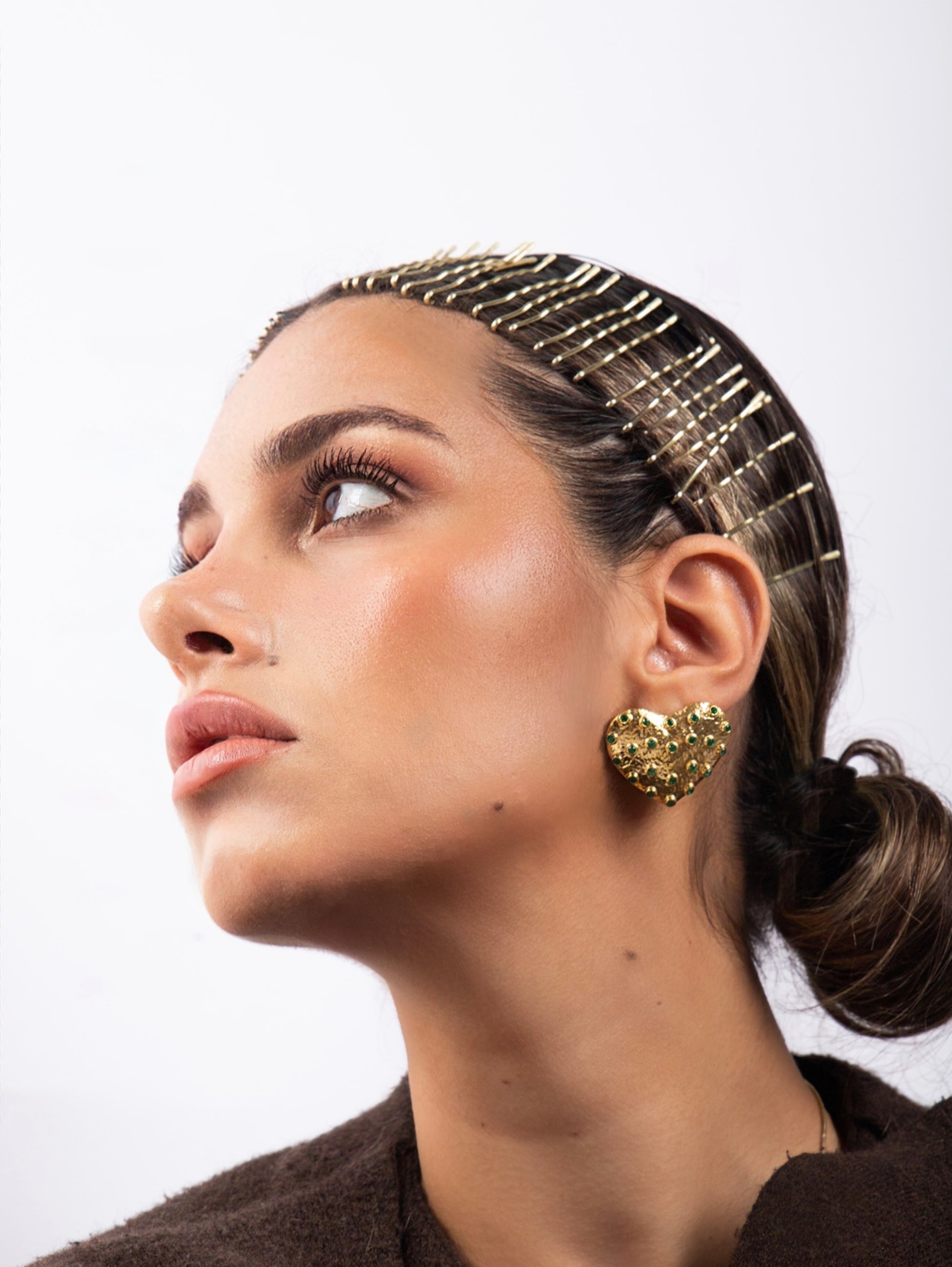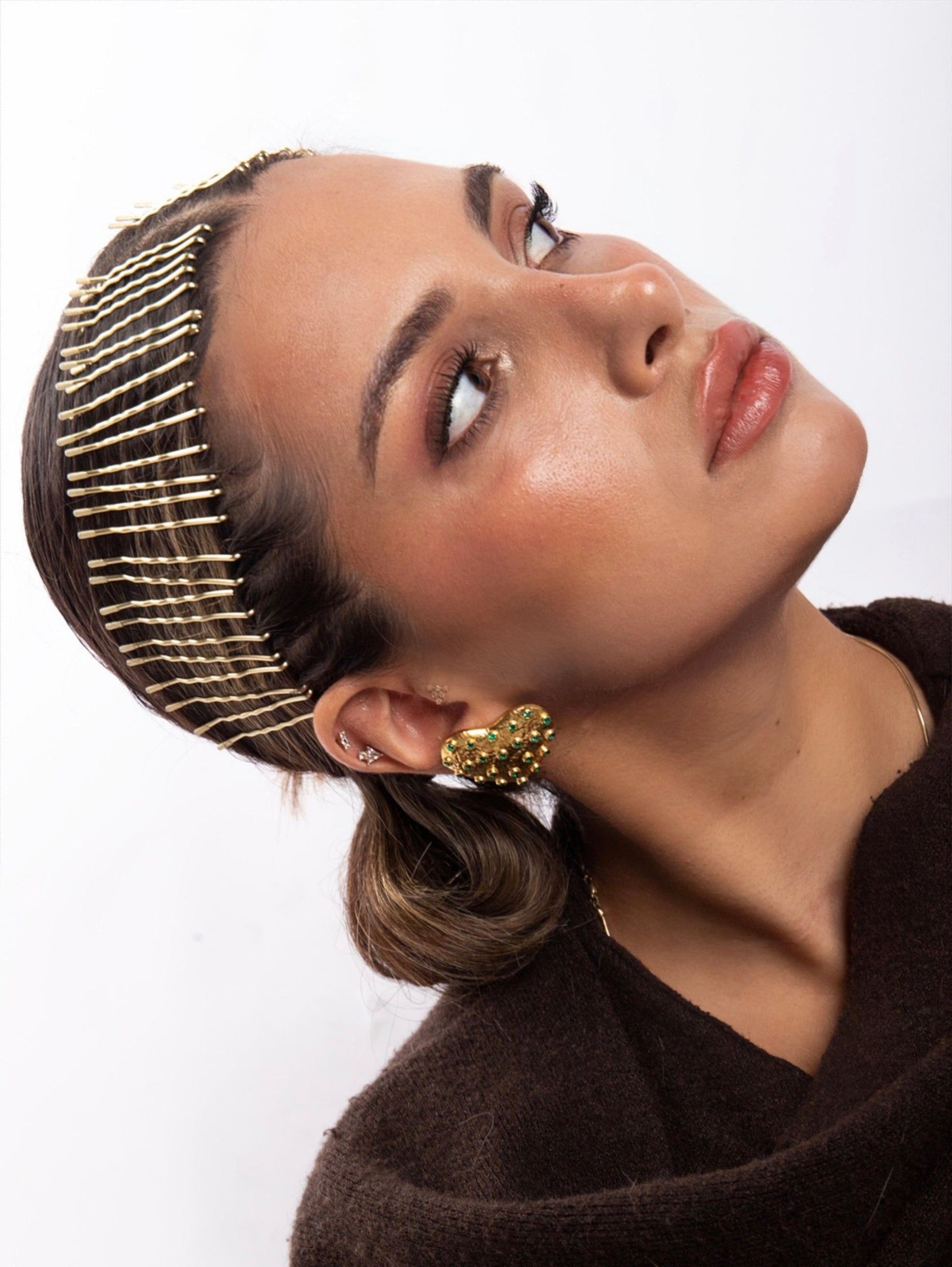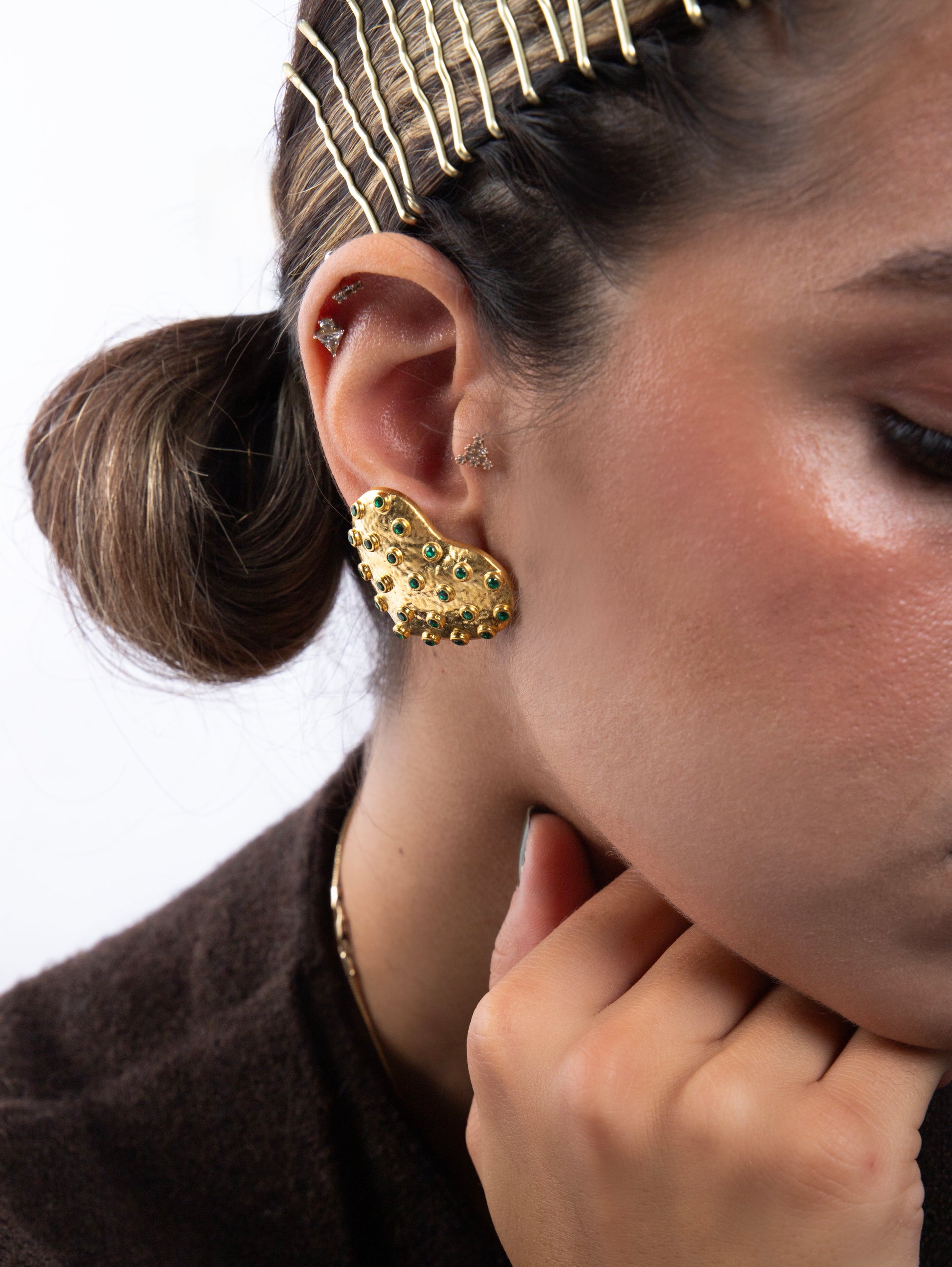 Giyilebilir bir sanat eseri olan bu heykelsi kulak manşeti, akıcı ve organik formuyla kulağı sarıyor. Altın kaplama el işçiliğiyle üretilen ve canlı yeşil turmalin taşlarıyla süslenen bu küpe, cesur bir zarafet ve modern bir çekicilik yayıyor. Avangart silüeti, klasik süslemeleri çağdaş bir sanat eserine dönüştürerek hem cesur hem de zamansız bir tasarım sunuyor.