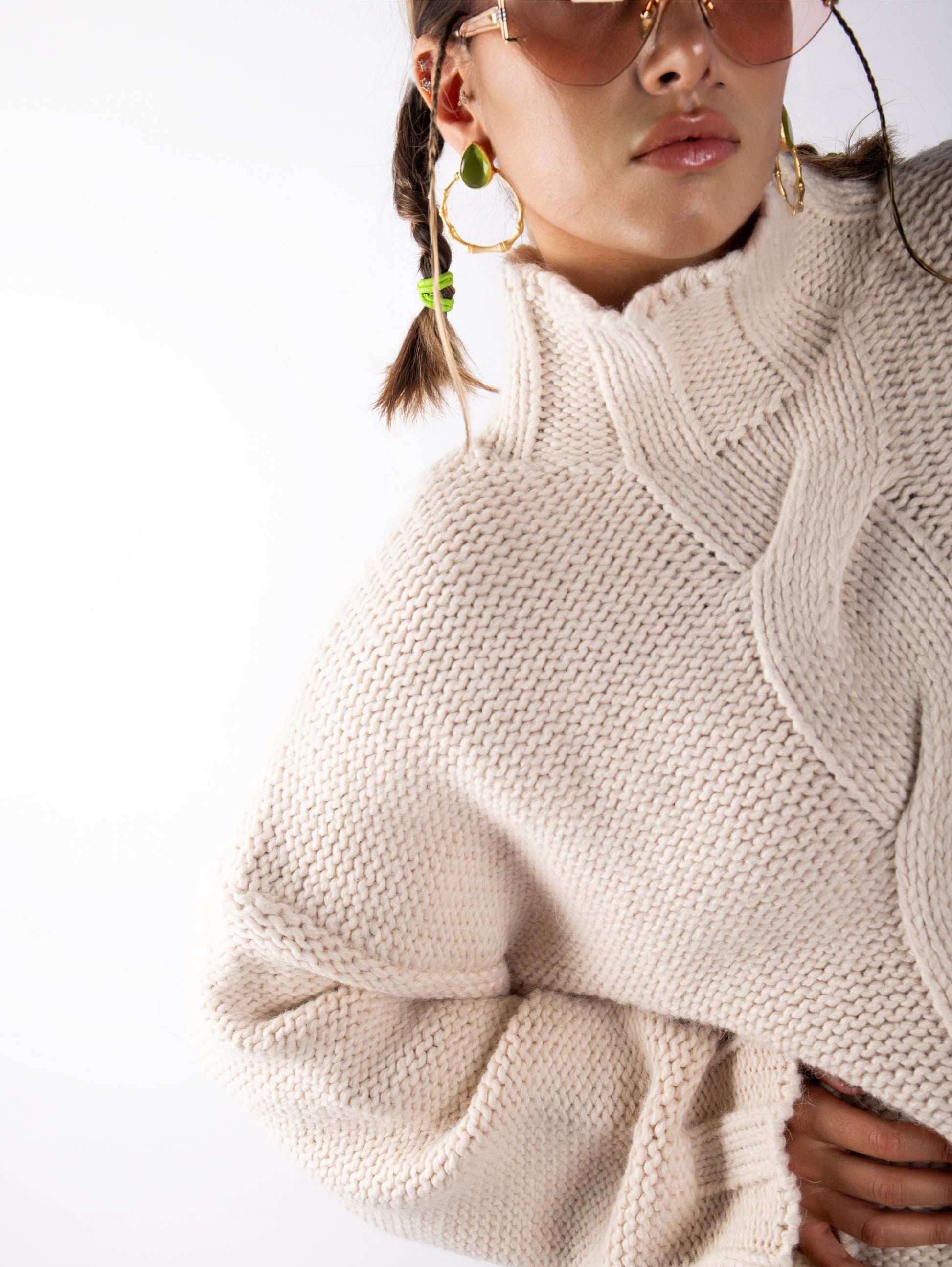Ayrıntılar: yüksek balıkçı yaka, heykelsi örgü, uzun kollar