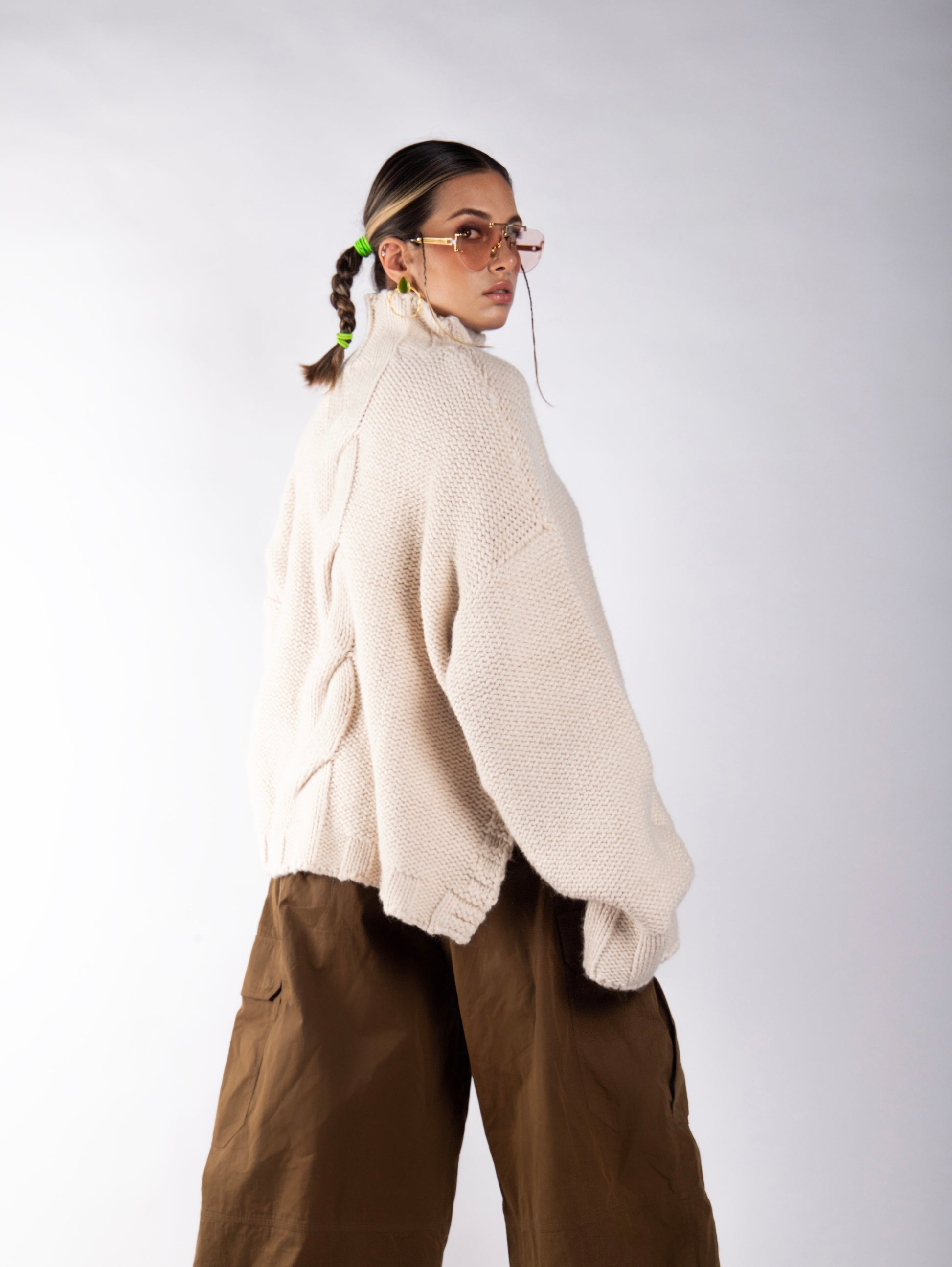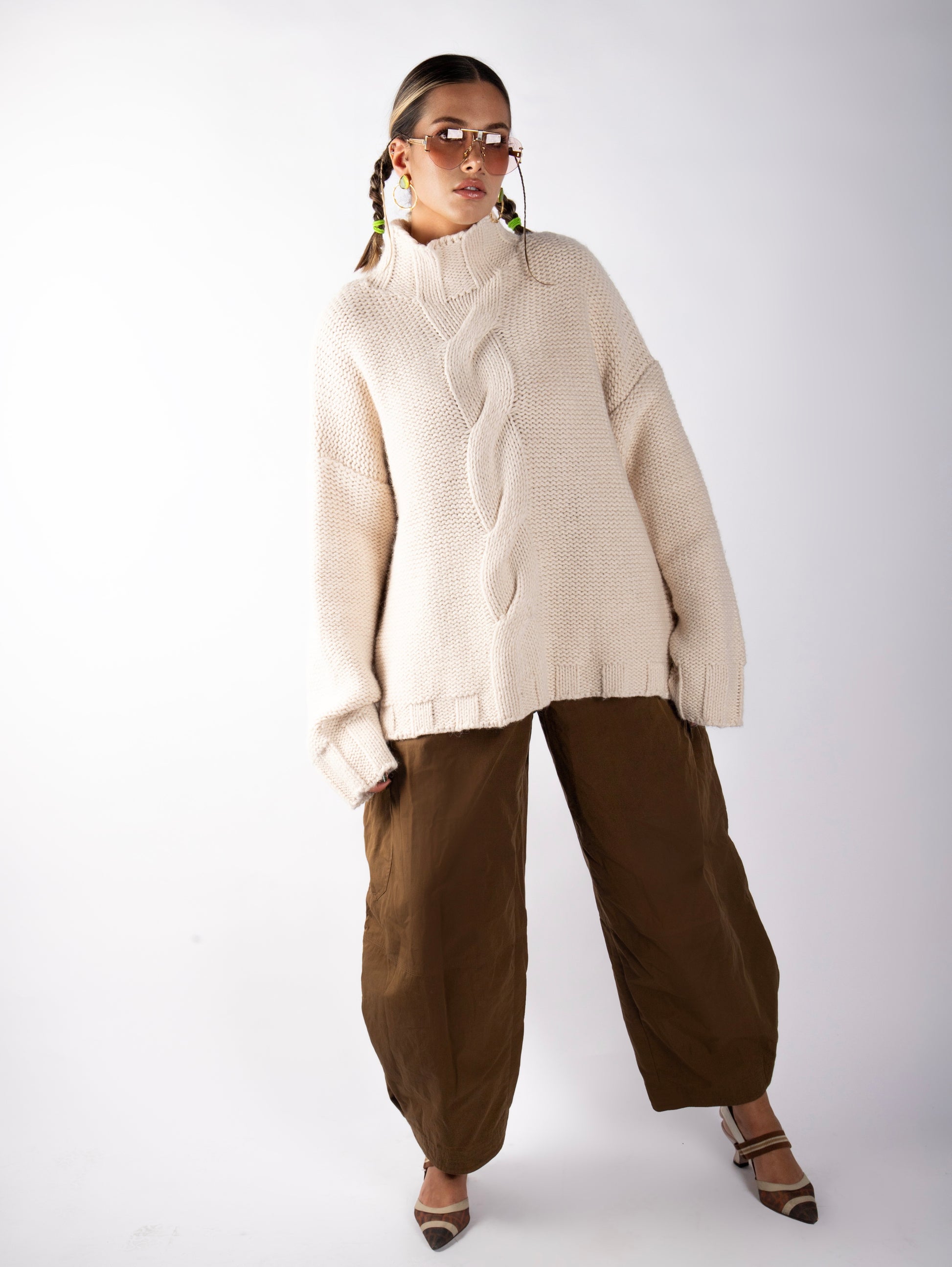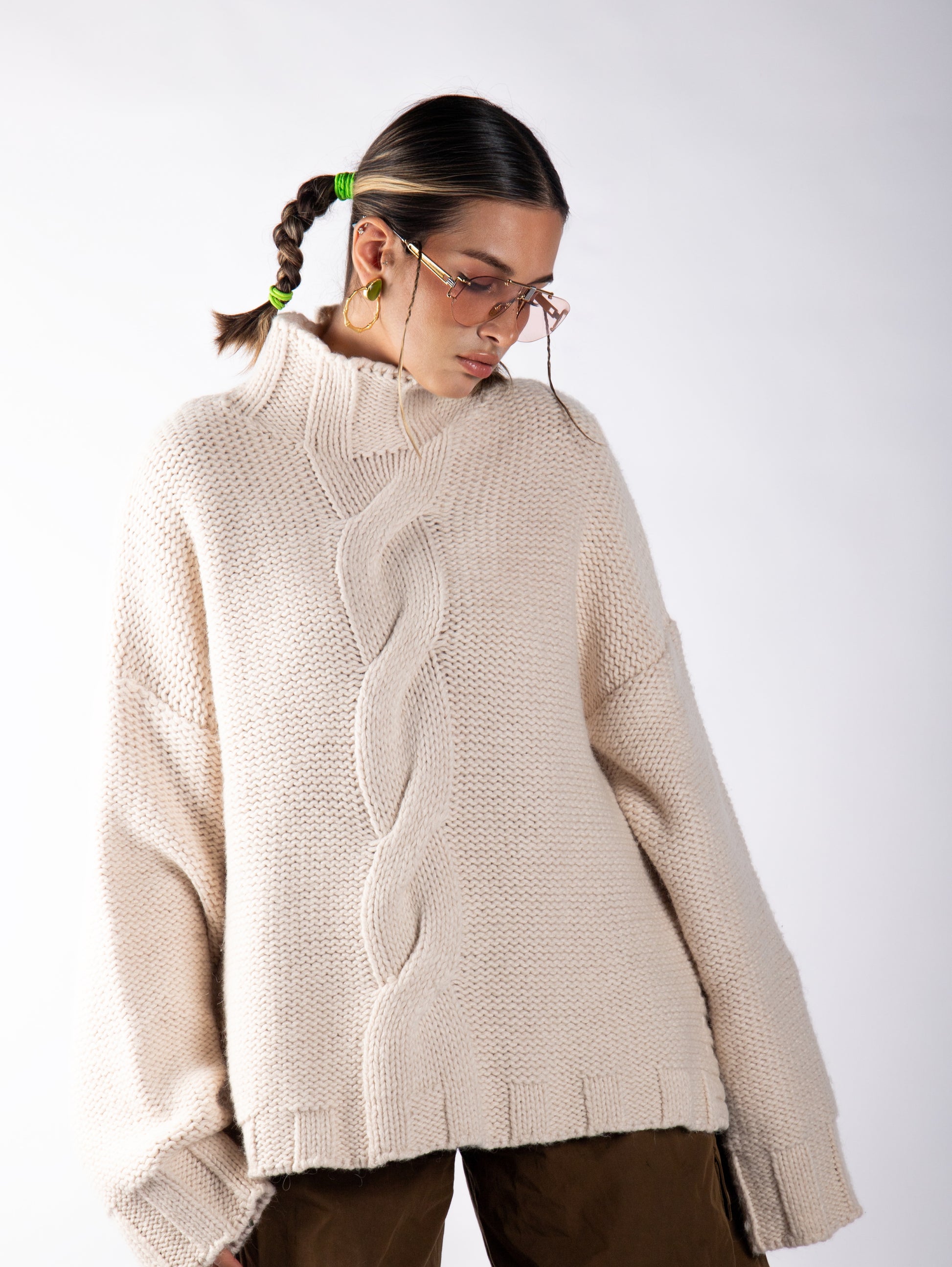 Birinci sınıf yün karışımlı örgüden özenle hazırlanmış, büyük boy balıkçı yaka kazak. Heykelsi örgü motifi ve cömert silüetiyle öne çıkan bu kazak, hem sıcaklığı hem de mimari hassasiyeti yansıtıyor.