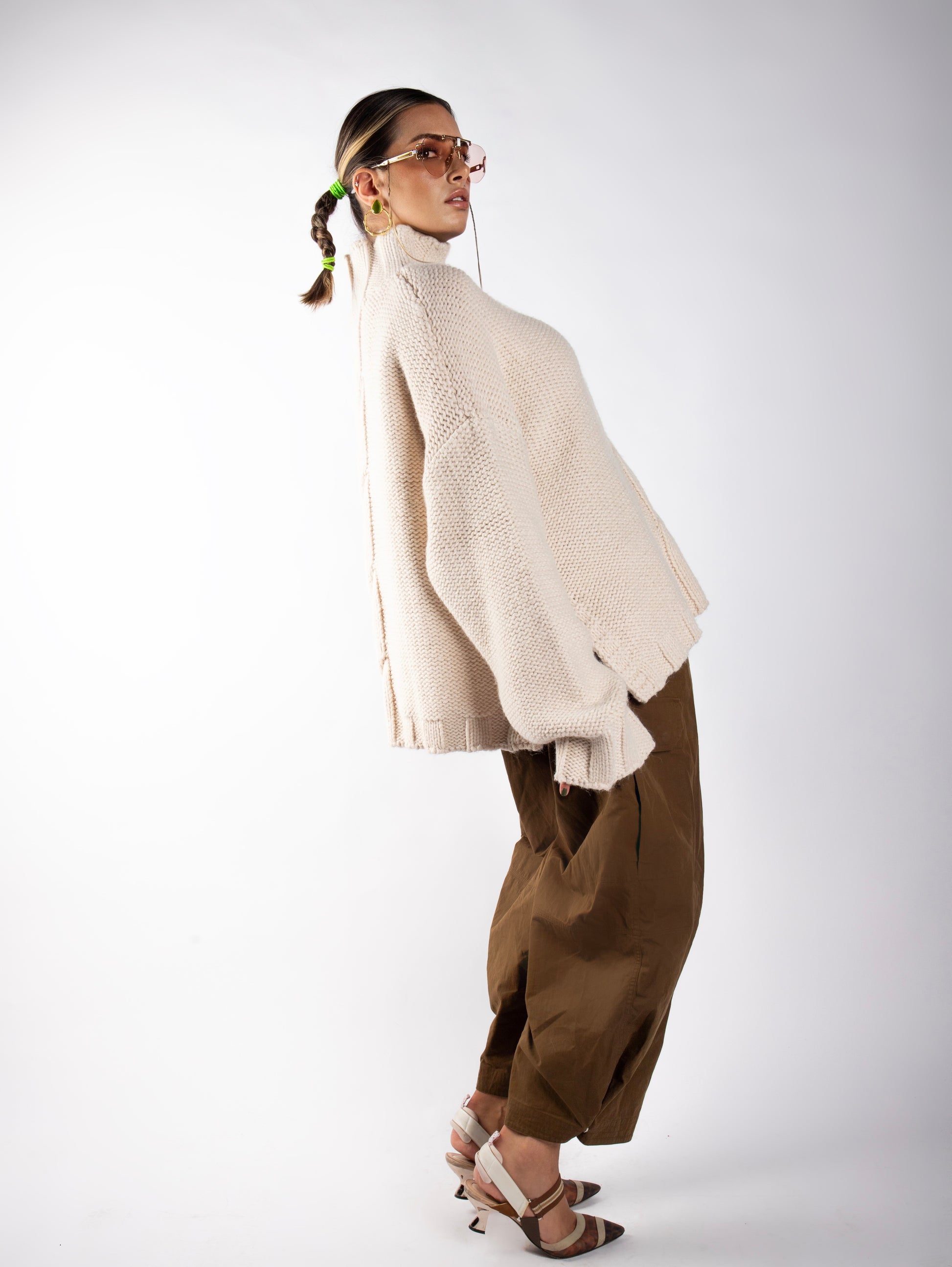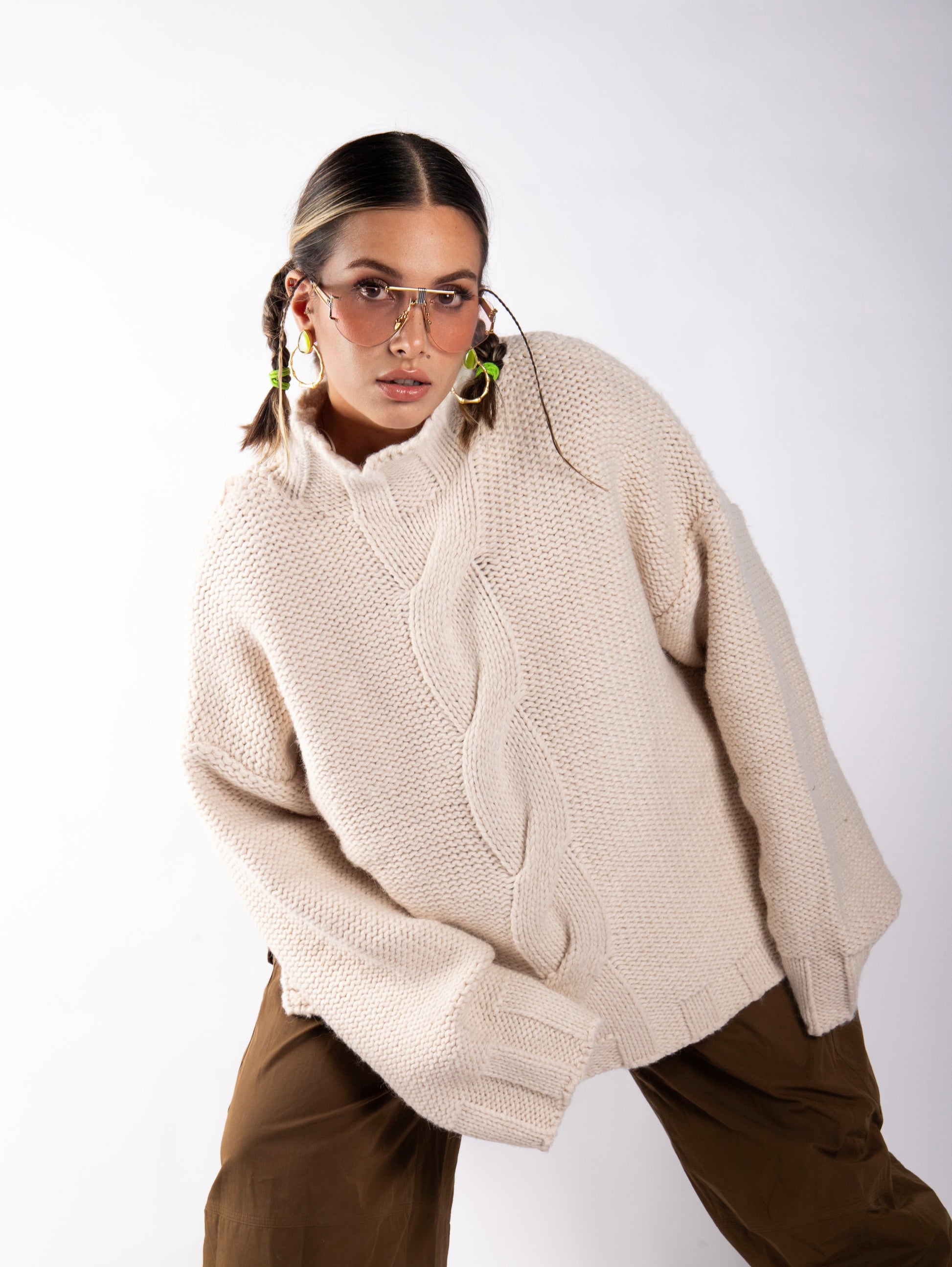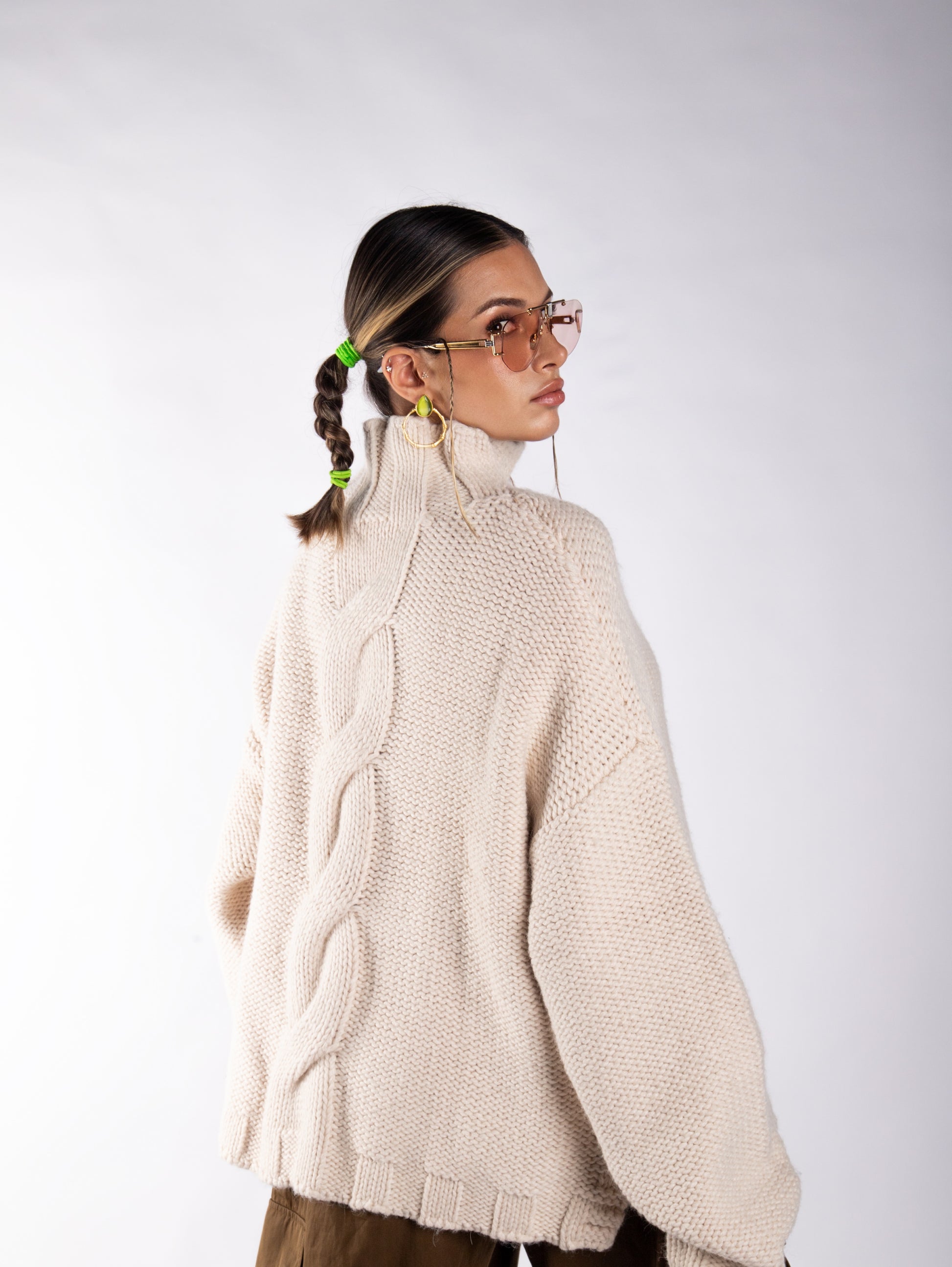 Birinci sınıf yün karışımlı örgüden özenle hazırlanmış, büyük boy balıkçı yaka kazak. Heykelsi örgü motifi ve cömert silüetiyle öne çıkan bu kazak, hem sıcaklığı hem de mimari hassasiyeti yansıtıyor.